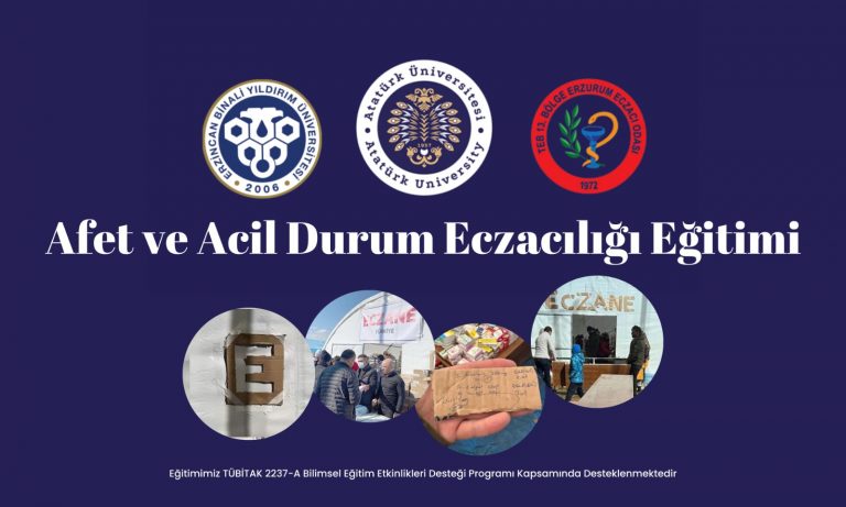 Etkinliğin Kapsamı: Bu amaçla Atatürk Üniversitesi Eczacılık Fakültesi, Erzincan Binali Yıldırım Üniversitesi Eczacılık Fakültesi ve 13.Bölge Erzurum Eczacı Odası işbirliği ile 13.Bölge Erzurum Eczacı Odası’na bağlı eczacılara ve eczacılık fakültesi öğrencilerine afet ve acil durum eczacılığı alanında çalışmaları ve tecrübesi bulunan eczacılar tarafından afet ve acil durum eczacılığı eğitimi verilecektir. Etkinlik sonunda geri bildirim alınacak ve katılımcılara katılım belgesi verilecektir.