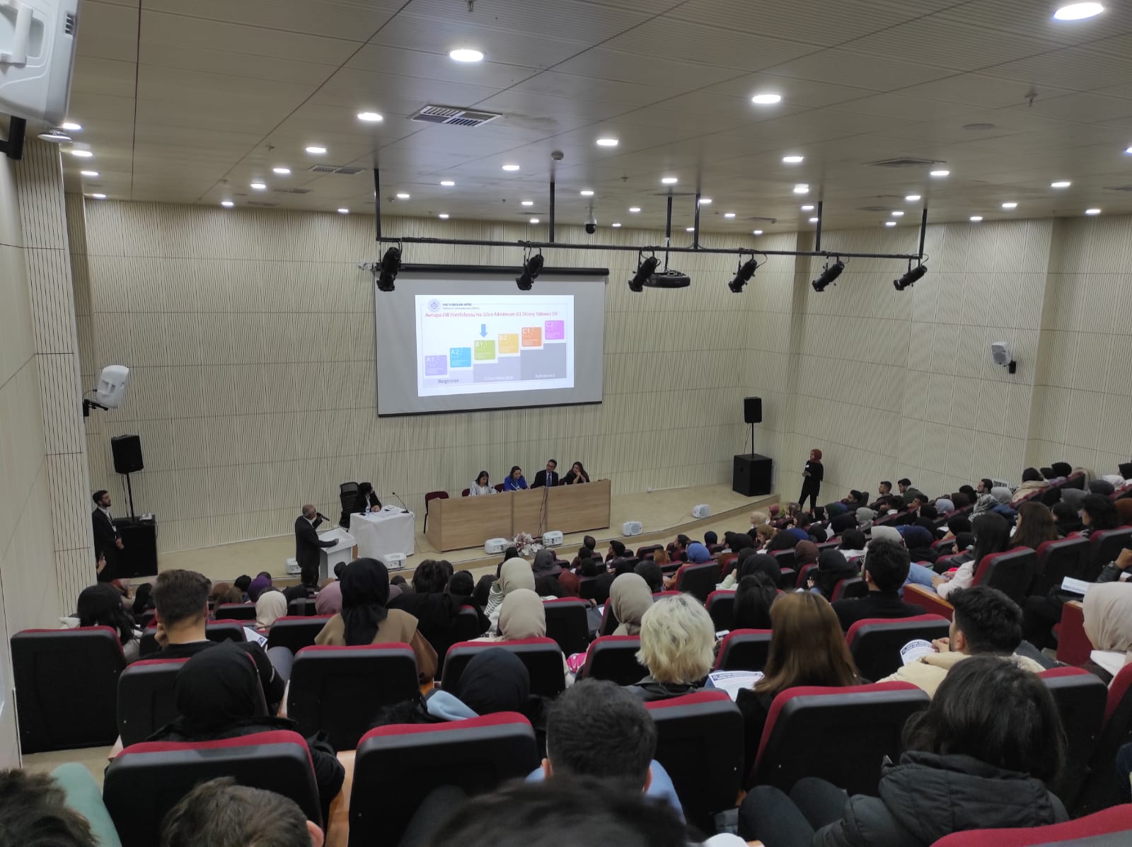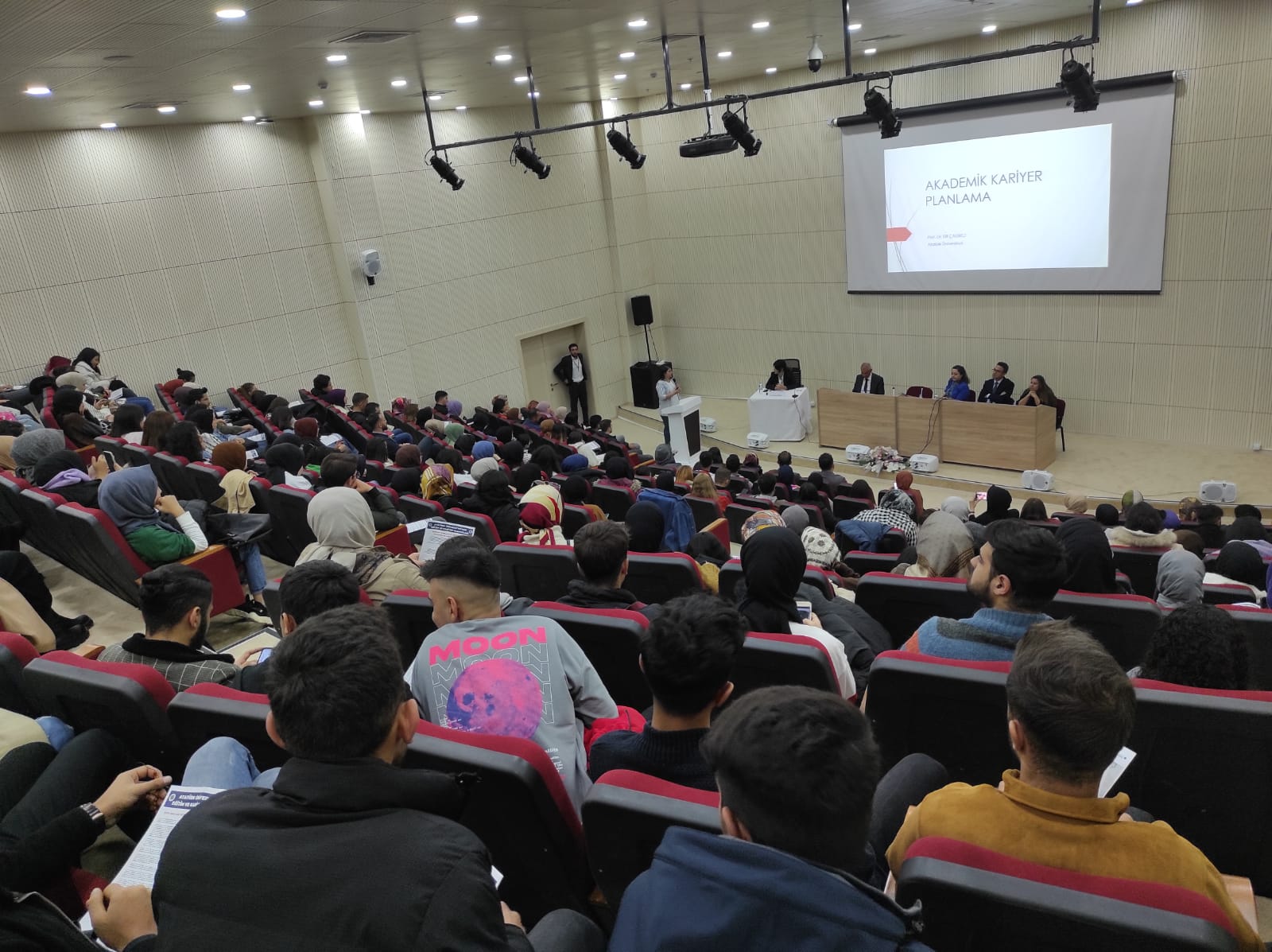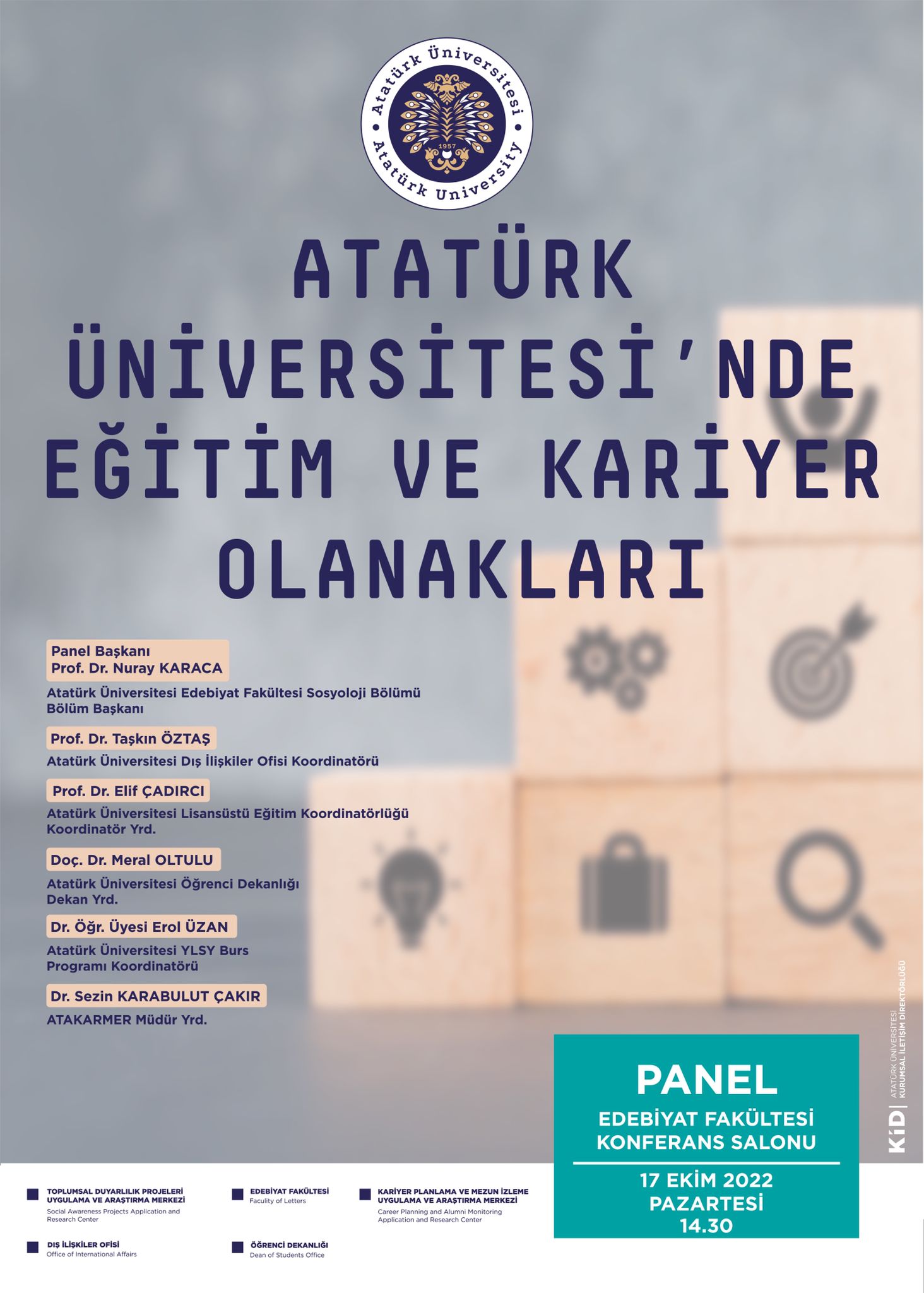 Toplumsal Duyarlılık Projeleri Uygulama ve Araştırma Merkezi tarafından desteklenen, Arş. Gör. Abdurrahim ŞAHİN danışmanlığında Edebiyat Fakültesi Sosyoloji Kulübü öğrencileri tarafından yürütülen “Atatürk Üniversitesi Öğrencilerinin Kariyer Motivasyonlarının ve Farkındalıklarının Geliştirilmesi” başlıklı toplumsal duyarlılık projesi kapsamında, 17.10.2022 tarihinde Edebiyat Fakültesi Konferans Salonunda “Atatürk Üniversitesi’nde Eğitim ve Kariyer Olanakları” başlıklı panel düzenlendi. Yaklaşık 300 öğrencinin katılım sağladığı panelin moderatörlüğünü Sosyoloji Bölümü Bölüm Başkanı Prof. Dr. Nuray KARACA üstlenirken, Dış İlişkiler Ofisi Koordinatörü Prof. Dr. Taşkın ÖZTAŞ, Lisansüstü Eğitim Koordinatörlüğü Koordinatör Yardımcısı Prof. Dr. Elif ÇADIRCI, Öğrenci Dekanlığı Dekan Yardımcısı Doç. Dr. Meral OLTULU, YLSY Burs Programı Koordinatörü Dr. Öğr. Üyesi Erol ÜZAN ve ATAKARMER Müdür Yardımcısı Dr. Sezin KARABULUT ÇAKIR panelist olarak konuşmalarını gerçekleştirdiler. Panel çerçevesinde; kariyer planlama süreçleri, lisansüstü eğitim süreçleri, sınav süreçleri, ERASMUS, FARABİ, MEVLANA, ORHUN vb. öğrenci değişim programları ve YLSY burs programı hakkında bilgi paylaşımında bulunuldu. Etkinlik, soru-cevap bölümü ve teşekkür belgelerinin takdimi ile sona erdi.