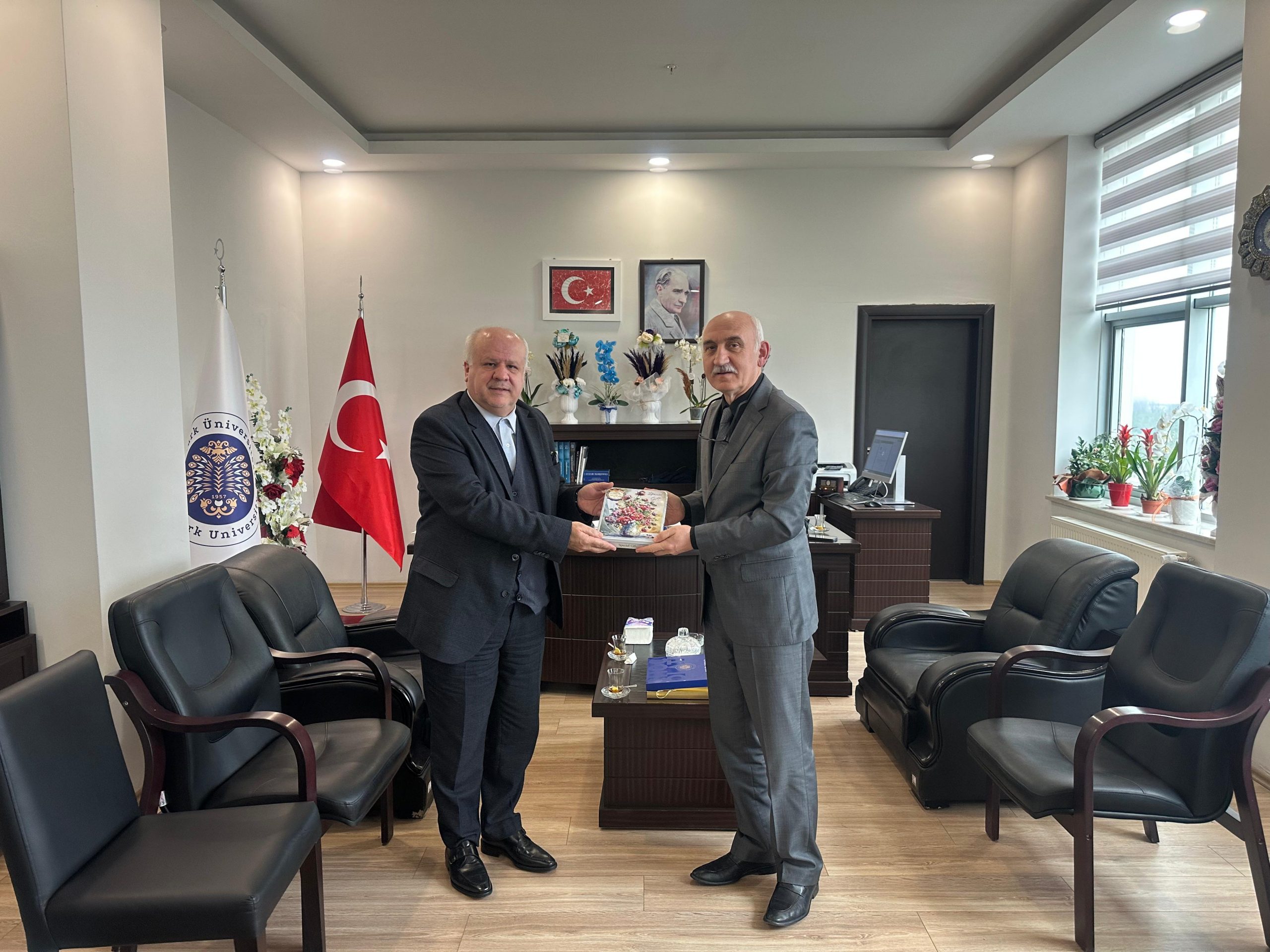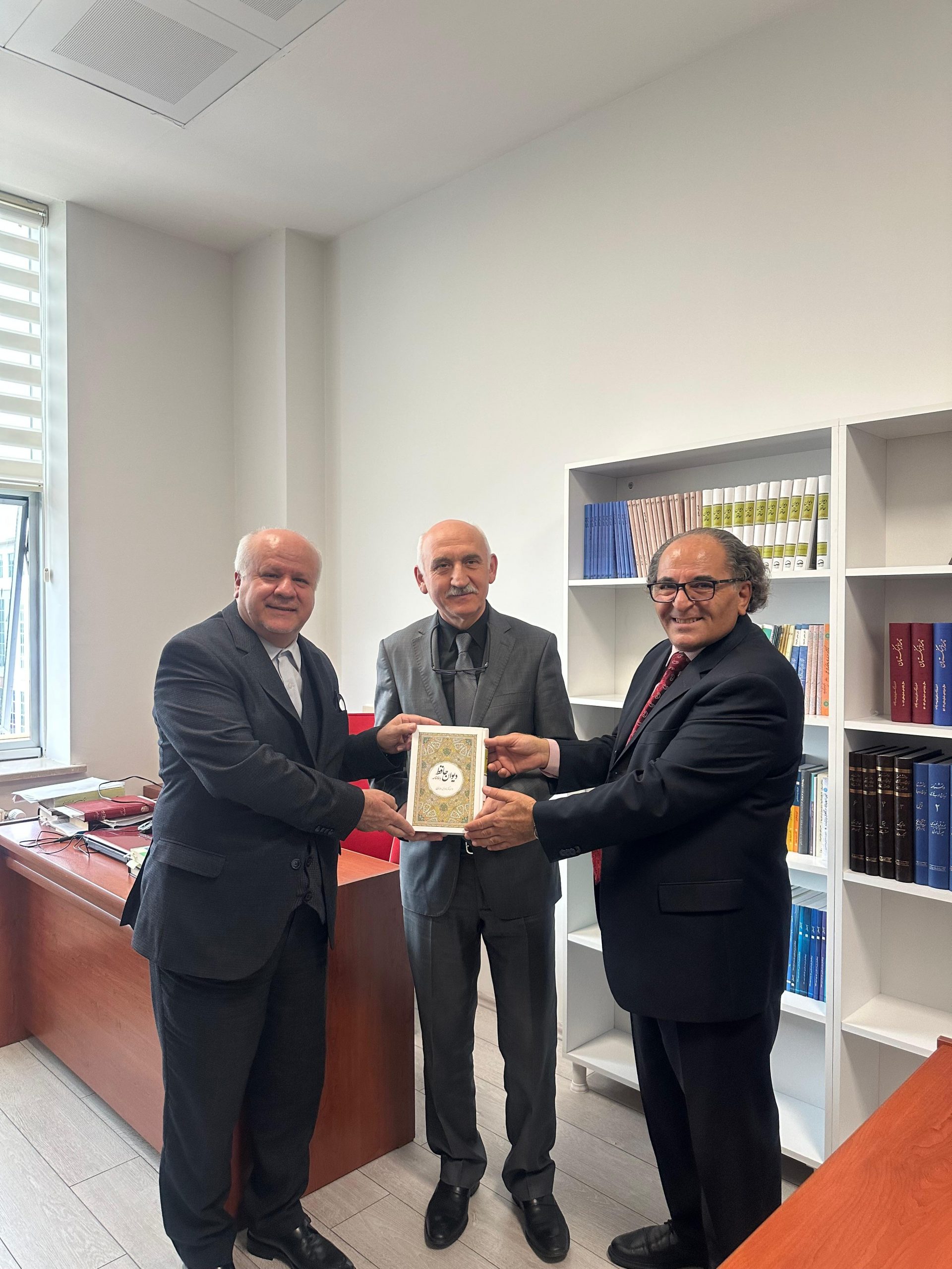 İran İslam Cumhuriyeti Erzurum Başkonsolosu Sayın Mohammad Ebrahimi ve Muavin Konsolos Hadi Javan, Dekanımız Prof. Dr. Süleyman Çiğdem’in yeni görevini tebrik ve Fars Dili ve Edebiyatı Bölüm kütüphanesini ziyaret için fakültemizi ziyaret etti. Mohammad Ebrahimi, Fars Dili ve Edebiyatı Bölümü Kütüphanesine İran Ferhengistan Kurumu tarafından hediye edilen kitaplar için teşekkürlerini dile getiren Fars Dili ve Edebiyatı Bölüm Başkanı Prof. Dr. Nimet Yıldırım’a kitap hediyelerinin ve İran ile Atatürk Üniversitesinin edebi ve kültürel ilişkilerinin devam edeceği müjdesini verdi.