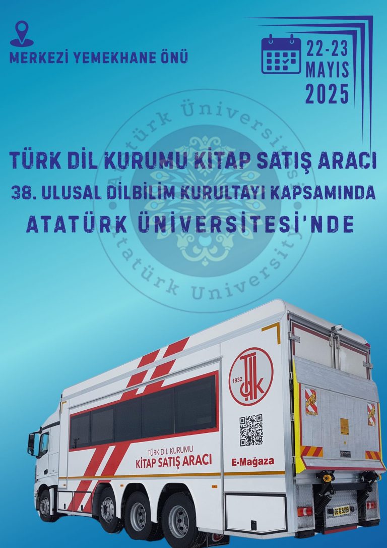 20 Mayıs 2025 Türk Dil Kurumu Kitap Satış Aracı Hakkında 38. Ulusal Dilbilim Kurultayı kapsamında üniversitemize gelecek olan Türk Dil Kurumu Kitap Satış Aracı, 22-23 Mayıs 2025 tarihlerinde Atatürk Üniversitesi Merkezi Yemekhane önünde hizmet verecektir.