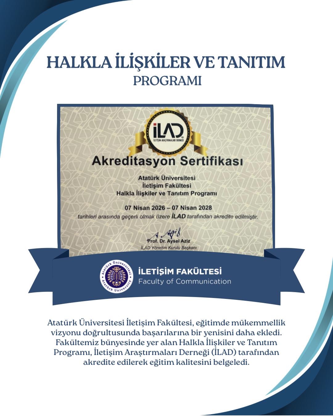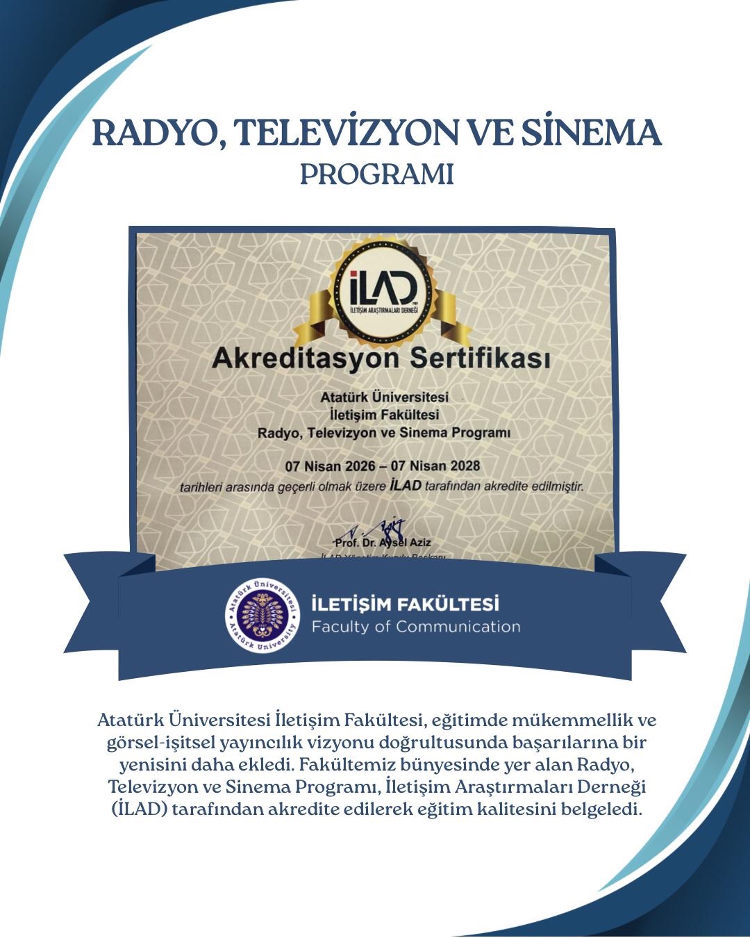 İLAD Yönetim Kurulu Başkanı Prof. Dr. Aysel Aziz’in imzasıyla yayımlanan sertifikalara göre; Gazetecilik, Radyo, Televizyon ve Sinema ile Halkla İlişkiler ve Tanıtım programlarımız, 07 Nisan 2026 – 07 Nisan 2028 tarihleri arasında geçerli olmak üzere tescillenmiştir. Standartlarını her geçen gün yükselten fakültemiz, bu süreçle birlikte iletişim eğitimi veren kurumlar arasındaki güçlü yerini sağlamlaştırmıştır.
