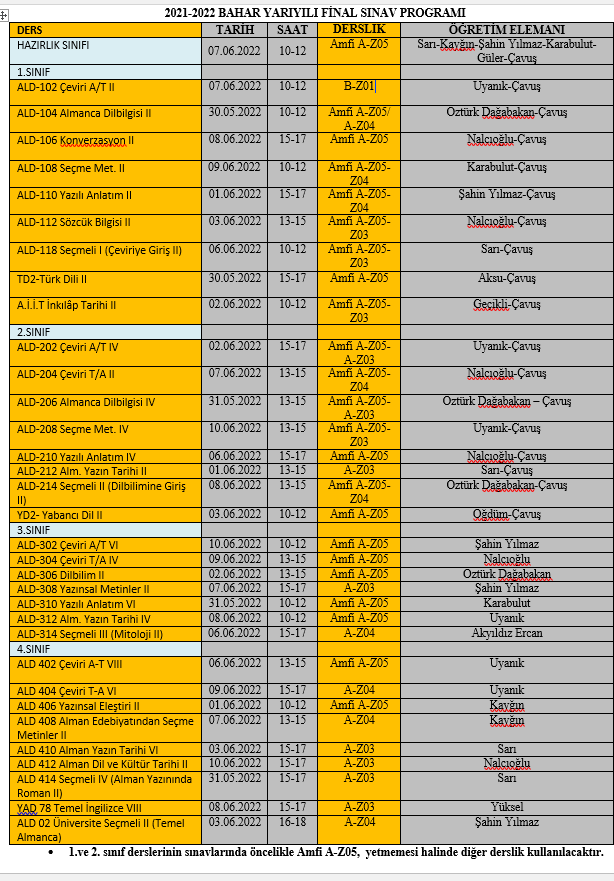 2021-2022 Bahar Yarıyıl Final Sınav Programı