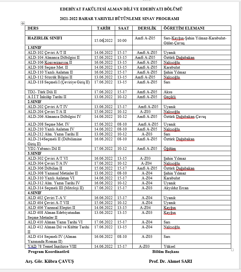 2021-2022 BAHAR YARIYILI BÜTÜNLEME SINAV PROGRAMI