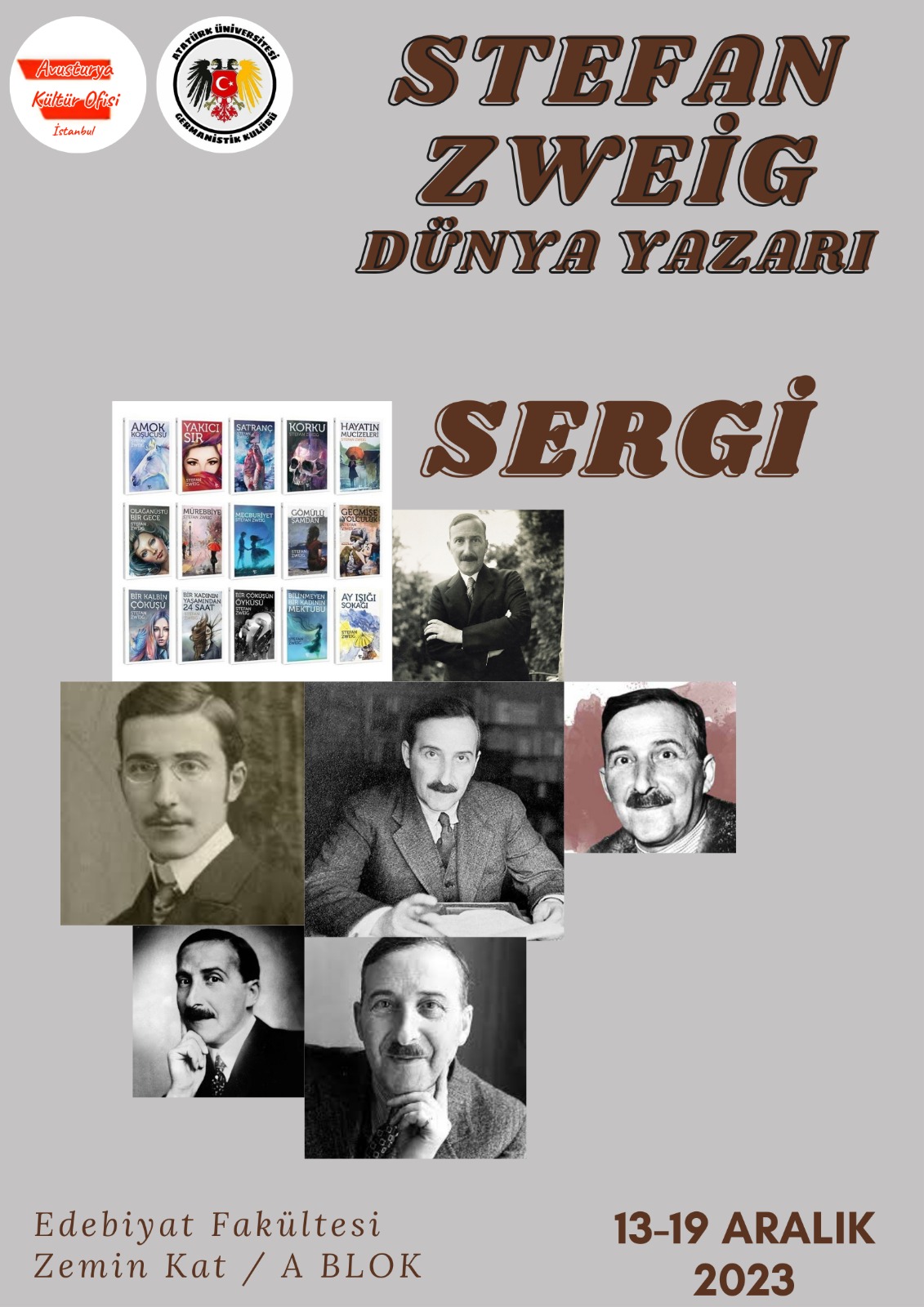Atatürk Üniversitesi Germanistik Kulübünün düzenlediği, Prof. Dr. Fatma ÖZTÜRK DAĞABAKAN’IN öncülük ettiği ve Avusturya Kültür Ofisinin desteklemiş olduğu “Stefan Zweig Dünya Yazarı’’ adlı sergi 13 – 14 – 15 Aralık 2023 tarihleri arasında Edebiyat Fakültesi A Blok zemin katta gerçekleşecektir. Avusturya Kültür Ofisi Müdürü Silvia NEUREITER katılım sağlayacaktır. Açılış konuşmasını Alman Dili ve Edebiyatı Bölüm Başkanı Prof. Dr. Gürsel UYANIK yapacaktır. Bu sergiyle bağlantılı olarak 15 Aralık Cuma günü saat 14.00 – 16.00 arası Edebiyat Fakültesi Konferans Salonunda Prof. Dr. Ahmet SARI konuşma yapacaktır.