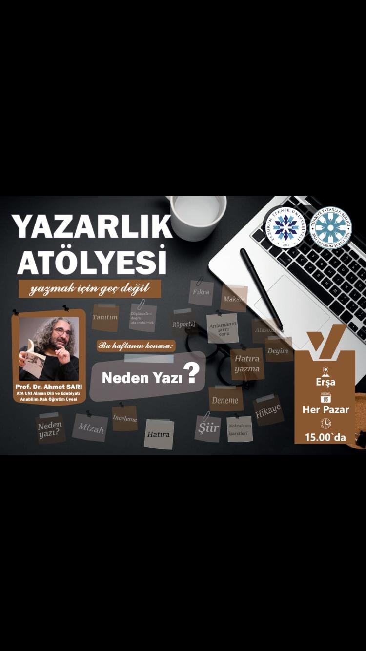 29 Nisan 2024 “Yazı Nedir” Konulu Konuşma Prof. Dr. Ahmet Sarı 28.04.2024 tarihinde Pazar günü saat 15.00’de ERŞA konağında Erzurum Yazarlar Birliği ve Erzurum Teknik Üniversitesi’nin ortaklaşa düzenledikleri Yazarlık Atölyesi’nde “Yazı Nedir” başlıklı konuşma yaptı.