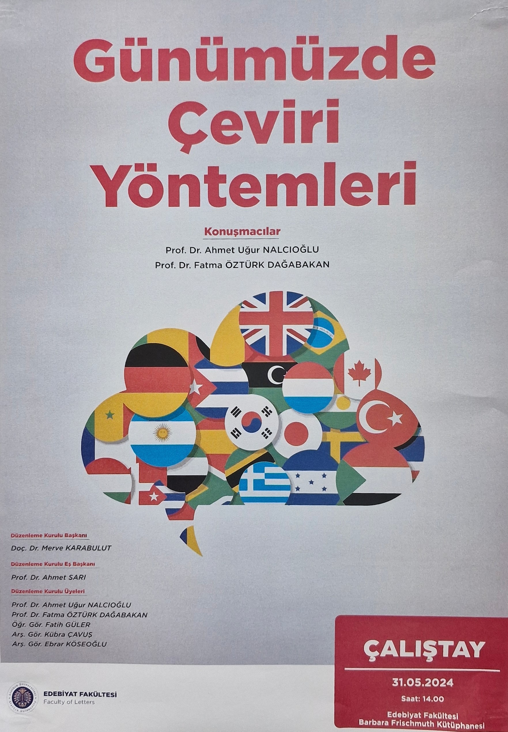 Doç. Dr. Merve Karabulut’un başkanlığını yaptığı “Günümüzde Çeviri Yöntemleri” adlı çalıştay 31 Mayıs 2024 tarihinde saat 14:00’de Edebiyat Fakültesi Barbara Frischmuth Kütüphanesinde gerçekleşmiştir. Çalıştayda Prof. Dr. Ahmet Uğur Nalcıoğlu ve Prof. Dr. Fatma Öztürk Dağabakan konuşma yapmıştır.