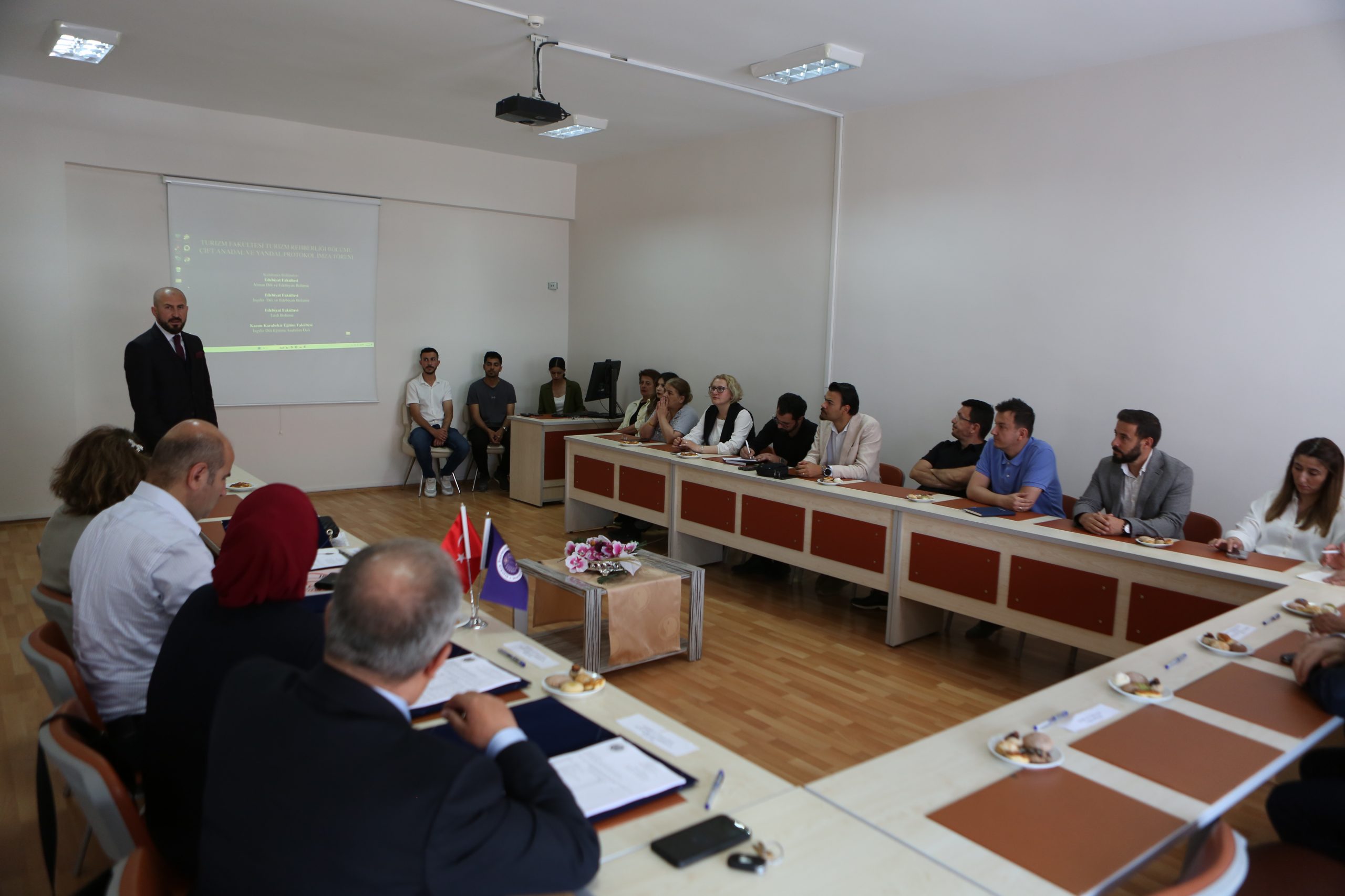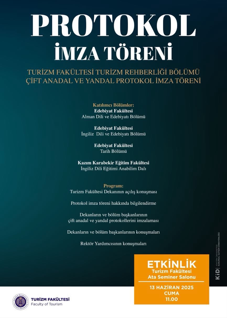 Üniversitemizde, disiplinler arası iş birliğini güçlendirmek ve öğrencilere akademik gelişimlerinde daha fazla fırsat sunmak amacıyla önemli bir adım atıldı. 13 Haziran 2025 Cuma günü saat 11.00’de Turizm Fakültesi’nde, Turizm Rehberliği Bölümü ile Alman Dili ve Edebiyatı Bölümü arasında çift anadal protokolü imzalandı. Program, Turizm Fakültesi Dekan Yardımcısı ve Turizm Rehberliği Bölüm Başkanı Prof. Dr. Ahmet Çavuş’un açılış konuşmasıyla başladı. Ardından, Turizm Fakültesi Dekanı Prof. Dr. Gökalp Nuri Selçuk, Kazım Karabekir Eğitim Fakültesi Dekanı Prof. Dr. Ufuk Şimşek, Edebiyat Fakültesi Dekanı Prof. Dr. Süleyman Çiğdem ve Alman Dili ve Edebiyatı Bölüm Başkanı Prof. Dr. Gürsel Uyanık tarafından protokol metinleri imzalandı.