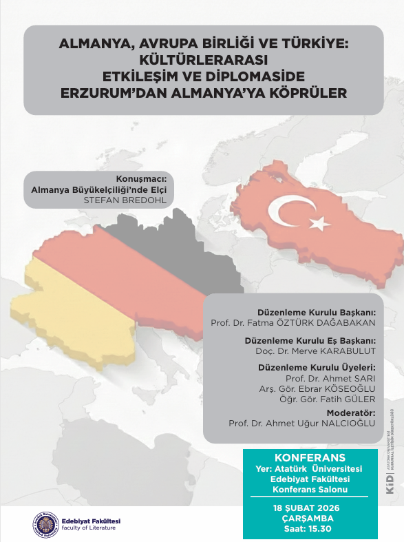 18 Şubat 2026 çarşamba saat 15.30′ da “ALMANYA, AVRUPA BİRLİĞİ VE TÜRKİYE: KÜLTÜRLERARASI ETKİLEŞİM VE DİPLOMASİDE ERZURUM’DAN ALMANYA’YA KÖPRÜLER” adlı konferans Atatürk Üniversitesi Edebiyat Fakültesi Konferans Salonunda gerçekleştirilecektir. Almanya Büyükelçiliği’nde Elçi Stefan BREDOHL konuşmacı olarak konferansa katılım sağlayacaktır.