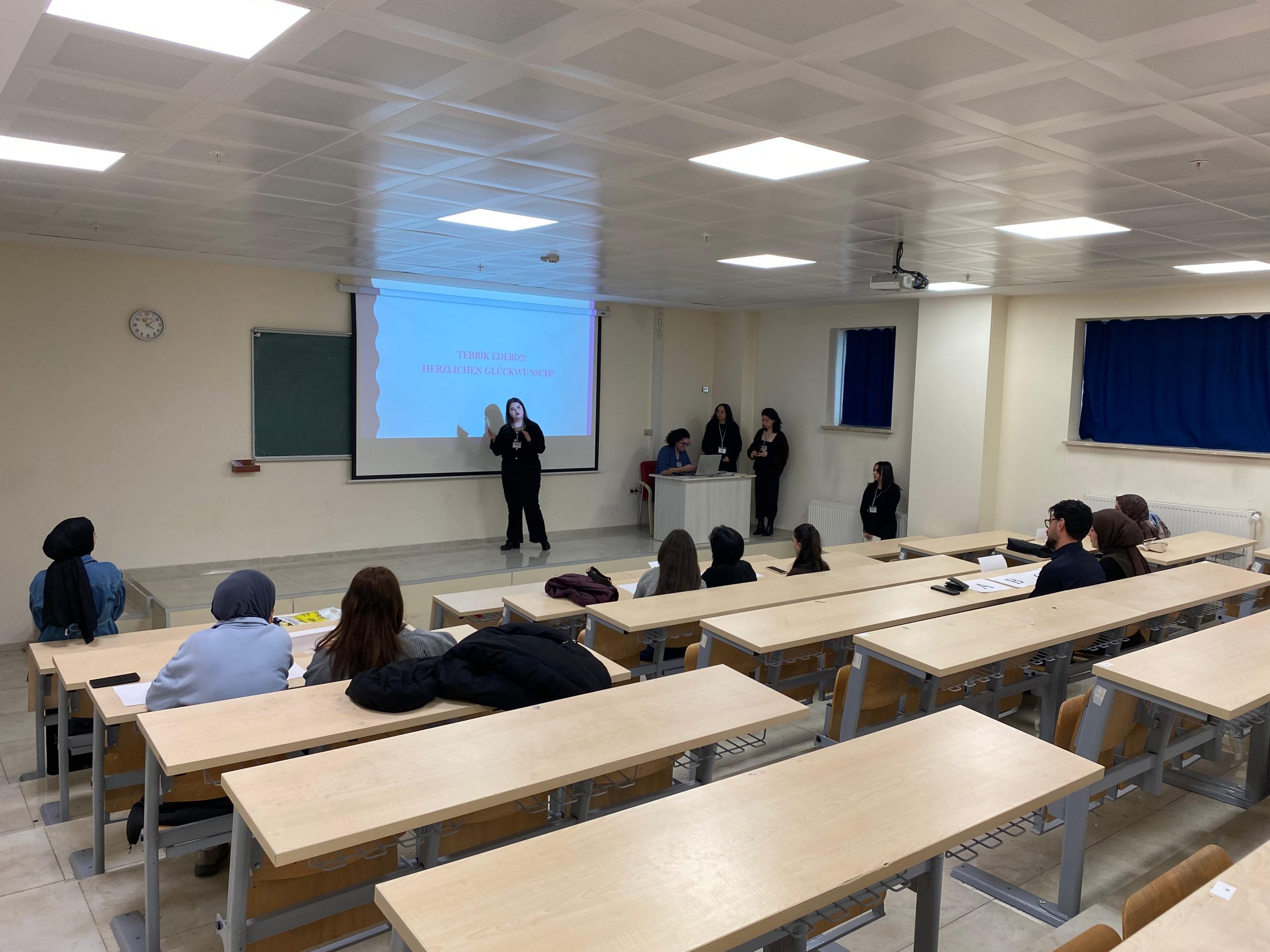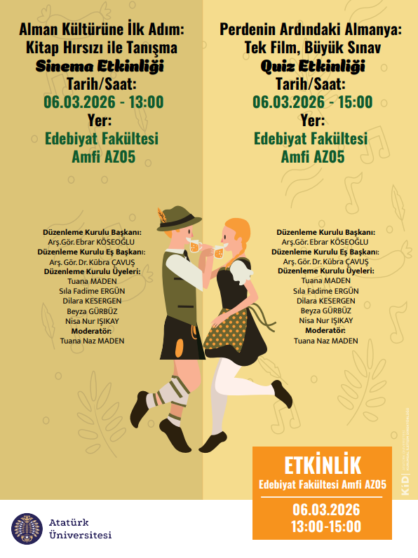 6 Mart 2026 tarihinde saat 13.00’te “Alman Kültürüne İlk Adım: Kitap Hırsızı ile Tanışma” başlıklı sinema etkinliği ve saat 15.00’te “Perdenin Ardındaki Almanya: Tek Film, Büyük Sınav” başlıklı quiz etkinliği Edebiyat Fakültesi AZ05 salonunda gerçekleştirilmiştir. Farklı bölümlerden öğrencilerin katılımıyla düzenlenen etkinlikte ilk olarak Kitap Hırsızı adlı film izlenmiş, ardından film üzerine hazırlanan sorularla bir quiz etkinliği yapılmıştır. Etkinliğin sonunda yarışmayı kazanan ekip ödüllendirilmiştir.
