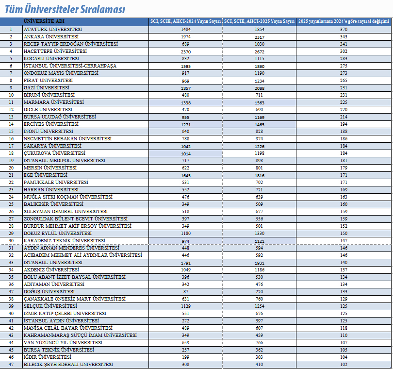 Atatürk Üniversitesi, uluslararası bilimsel yayın alanında gösterdiği istikrarlı yükselişle önemli bir başarıya imza attı. Üniversite 2025 yılında; SCI, SCIE ve AHCI indekslerinde yer alan yayın sayılarıyla tüm üniversiteler arasında bir önceki yıla göre yayın sayısını en fazla artıran üniversite olarak ilk sırada yer aldı.