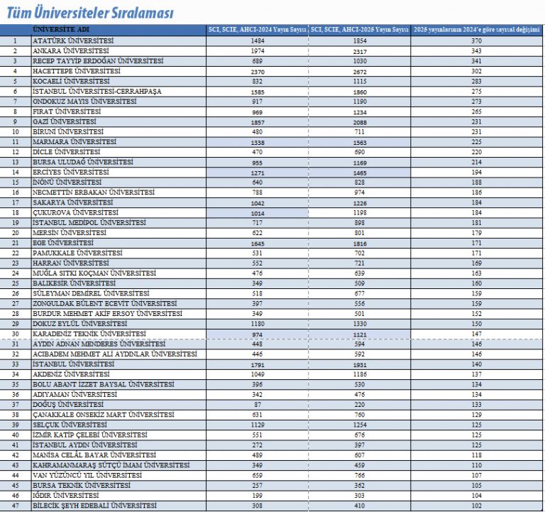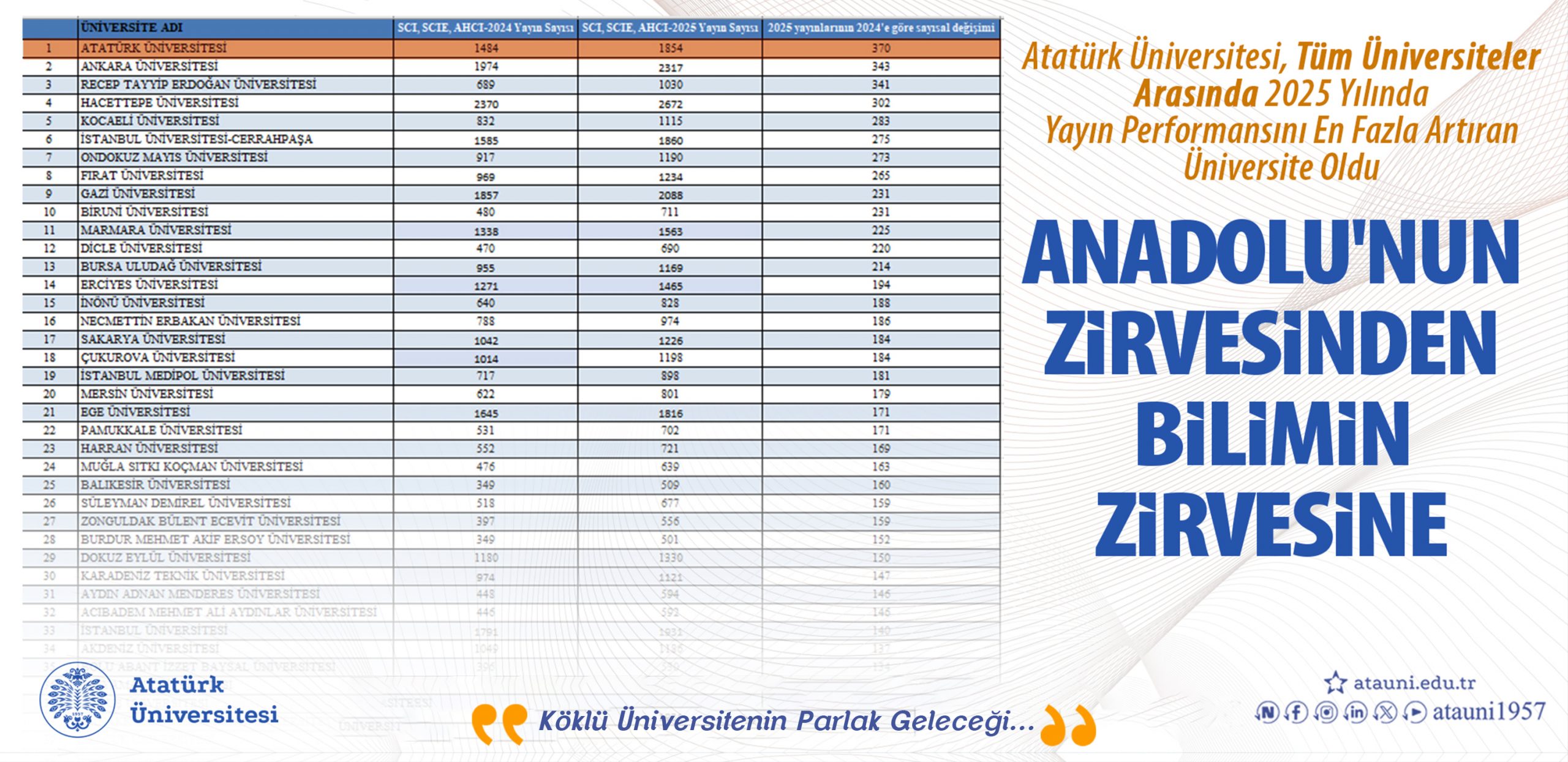 Atatürk Üniversitesi, uluslararası bilimsel yayın alanında gösterdiği istikrarlı yükselişle önemli bir başarıya imza attı. Üniversite 2025 yılında; SCI, SCIE ve AHCI indekslerinde yer alan yayın sayılarıyla tüm üniversiteler arasında bir önceki yıla göre yayın sayısını en fazla artıran üniversite olarak ilk sırada yer aldı.
