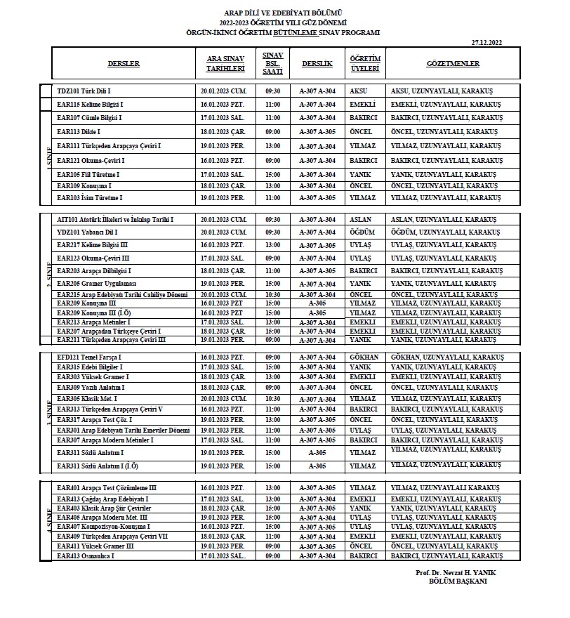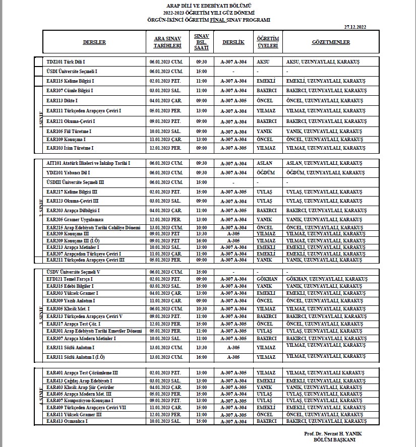 23 Aralık 2022 2022-2023 Eğitim-Öğretim Yılı Güz Yarıyılı Final-Bütünleme Programı Final-Bütünleme programına ulaşmak için tıklayınız.