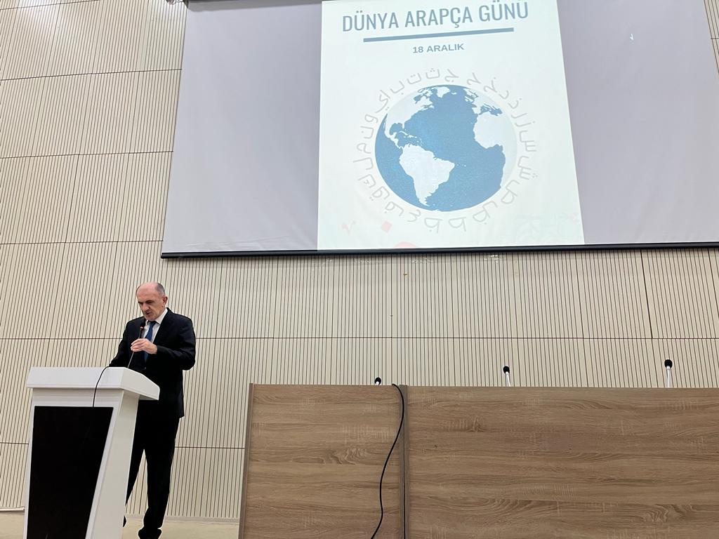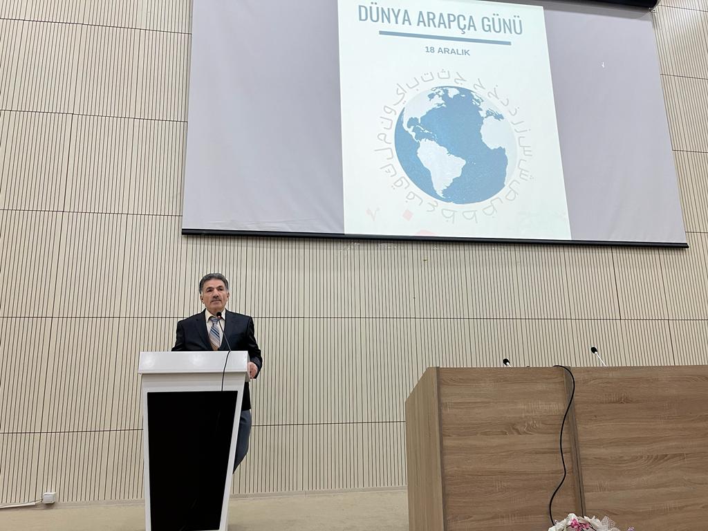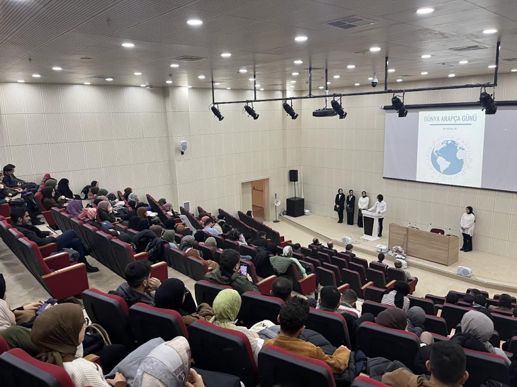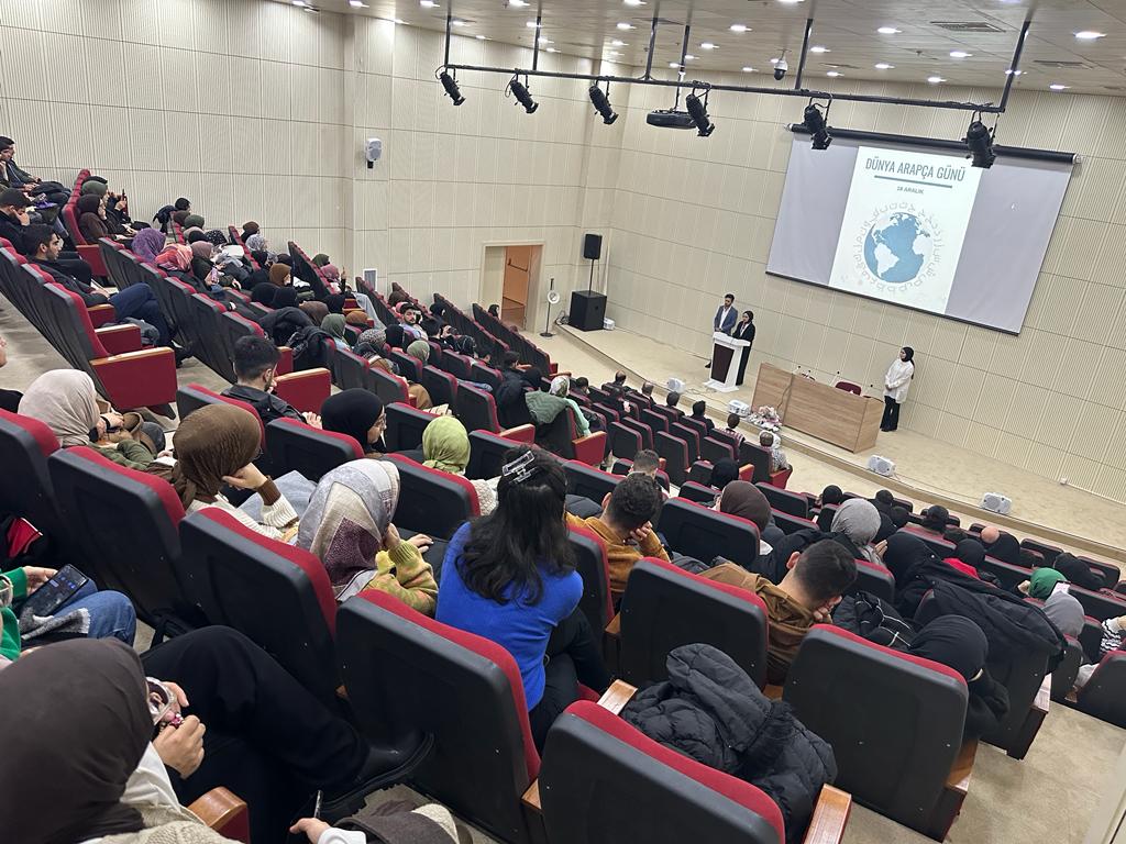 Üniversitemiz Edebiyat Fakültesi Arap Dili ve Edebiyatı Bölümü, Arap Dili ve Edebiyatı Kulübü iş birliğinde “18 Aralık Dünya Arapça Günü” kapsamında etkinlikler gerçekleştirildi. Edebiyat Fakültesi Konferans Salonunda gerçekleşen etkinliğe bölümümüz öğretim üyeleri ve çok sayıda öğrenci katıldı. Etkinliğin açılış konuşmasını yapan Bölüm Başkanımız Prof. Dr. Nevzat H. YANIK, UNESCO tarafından 18 Aralık gününün Dünya Arapça Günü olarak kabul edildiğini hatırlatarak, Arapça, Birleşmiş Milletlerin resmî dil olarak tanıdığı 6 dilden biri olduğuna vurgu yaptı. Etkinlik, öğrencilerin birbirinden güzel şiir ve bildirilerini sunmasının akabinde kulüp danışman hocası Doç. Dr. Nurullah YILMAZ’ın Arapçanın önemine ve kulüp faaliyetleri hakkında yaptığı bilgilendirici konuşmasıyla sona erdi.