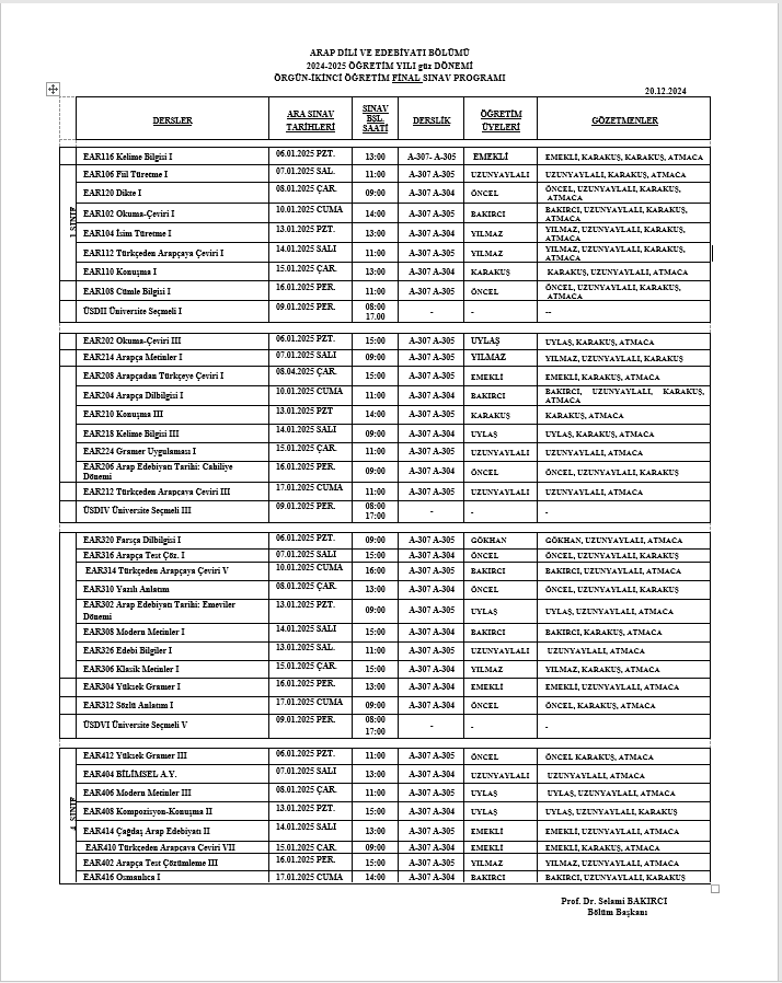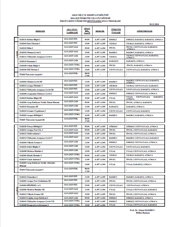 2024-2025 Eğitim-Öğretim Yılı Güz Yarıyılı Final Bütünleme Programı