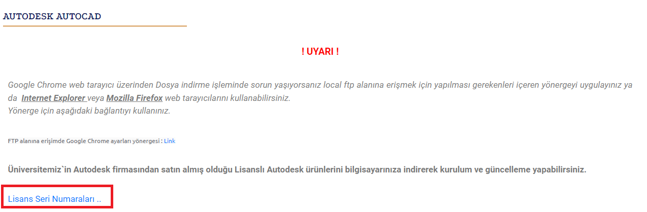 Üniversitemiz`in Autodesk firmasından satın almış olduğu Lisanslı Autodesk ürünlerini bilgisayarınıza indirerek kurulum ve güncelleme yapabilirsiniz.