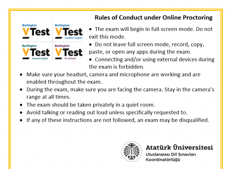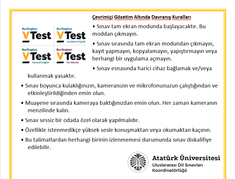 Sınavınızın geçerli sayılabilmesi için sınav kurallarına uymanız gerekmektedir. Kural ihlalleri durumunda sınavınız geçersiz sayılacaktır. Bu nedenle aşağıda İngilizce ve Türkçe olarak verilen talimatları dikkatlice okuyunuz.
