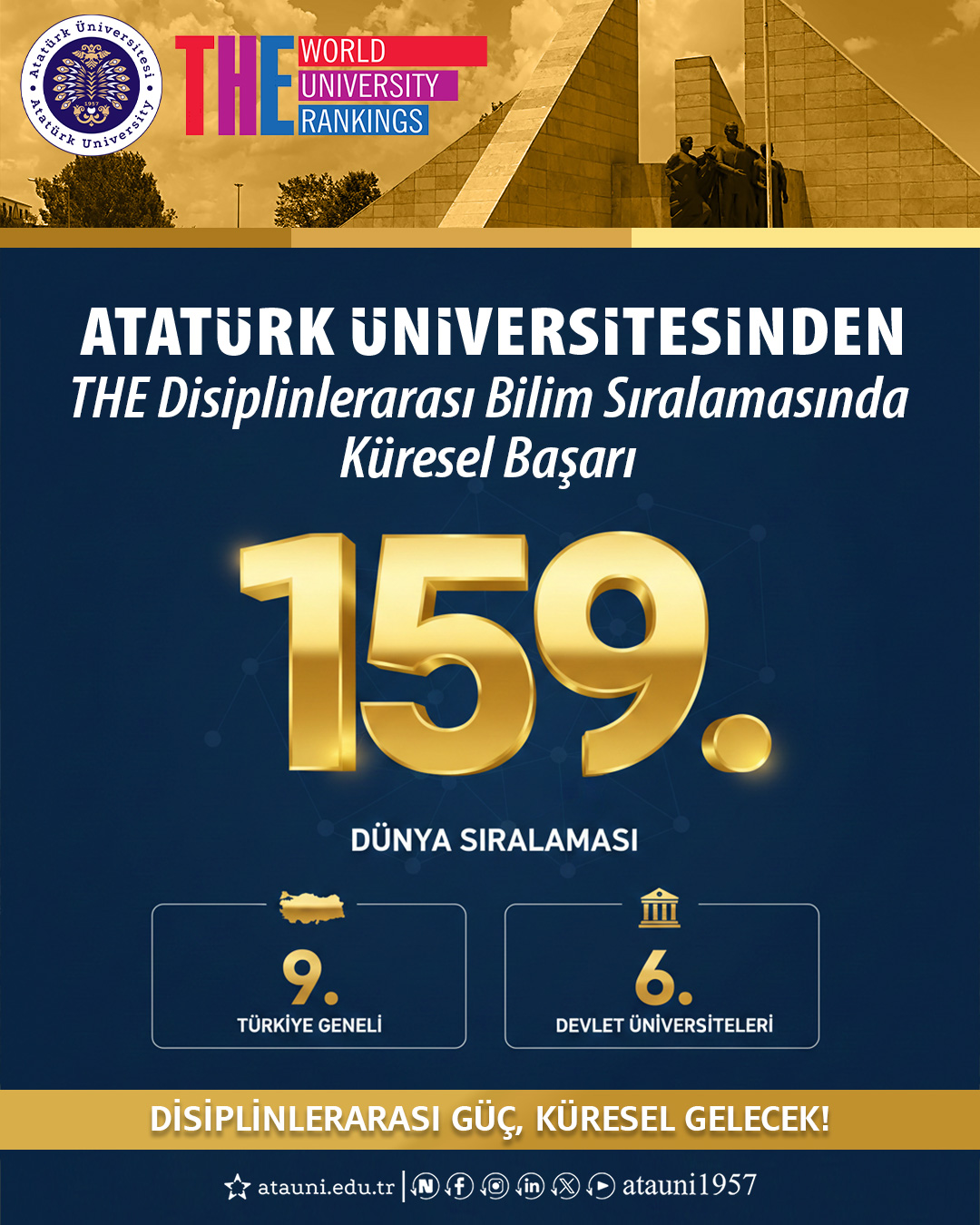 Dünyadan yüzlerce üniversitenin başvurduğu sıralamada Atatürk Üniversitesi, 159. sıraya yerleşerek küresel ölçekte önemli bir başarı elde etti. Türkiye genelinde 9., devlet üniversiteleri arasında ise 6. sırada konumlanan üniversite, ulusal ve uluslararası arenada yükselen ivmesini sürdürdü.