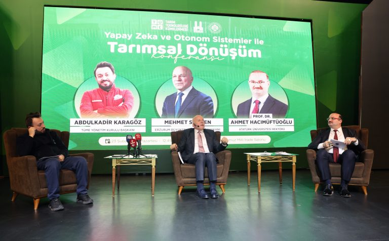 Atatürk Üniversitesi ev sahipliğinde düzenlenen “Yapay Zekâ ve Otonom Sistemler ile Tarımsal Dönüşüm” konferansı; akademisyenler, sektör temsilcileri ve öğrencileri bir araya getirdi. Moderatörlüğünü Atatürk Üniversitesi Rektörü Prof. Dr. Ahmet Hacımüftüoğlu’nun yaptığı etkinlikte, Erzurum Büyükşehir Belediye Başkanı Mehmet Sekmen ve Tarım Teknolojileri Kümelenmesi (TÜME) Vakfı Yönetim Kurulu Başkanı Abdulkadir Karagöz, tarımda teknolojik devrimin yol haritasını çizdi.
