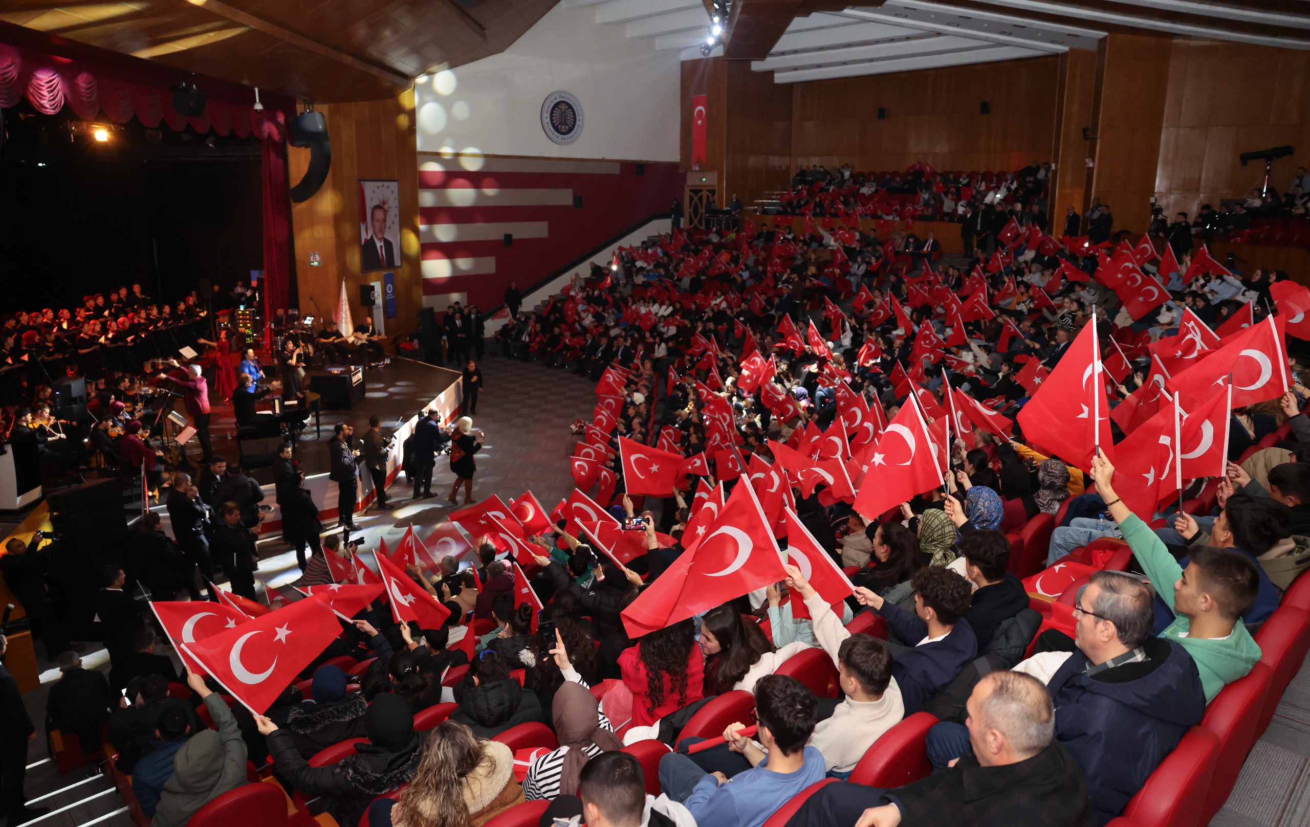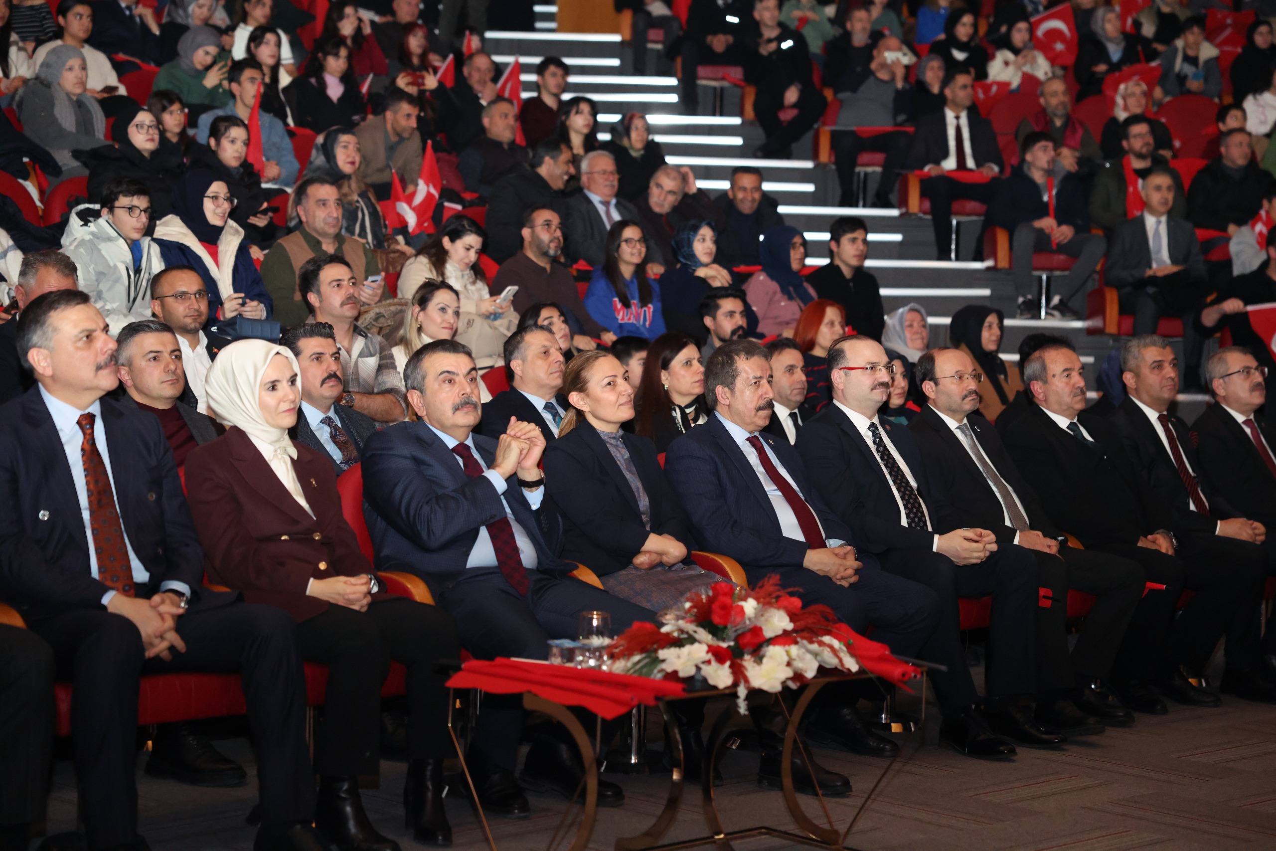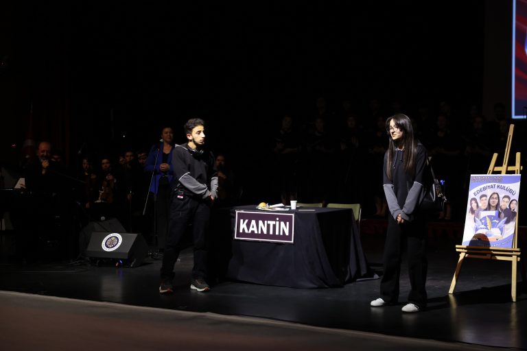 Öğrencilerin tiyatral sunumlarıyla zenginleştirilen performanslar, şiirlere güçlü sahne vurguları kazandırırken; Sayın Yücel Arzen tarafından bestelenen “Türkiye Yüzyılı” şarkısının seslendirilmesiyle salon Türk bayrakları eşliğinde kırmızı beyaza büründü. Katılımcıların coşkuyla eşlik ettiği eser, programa damga vurdu.