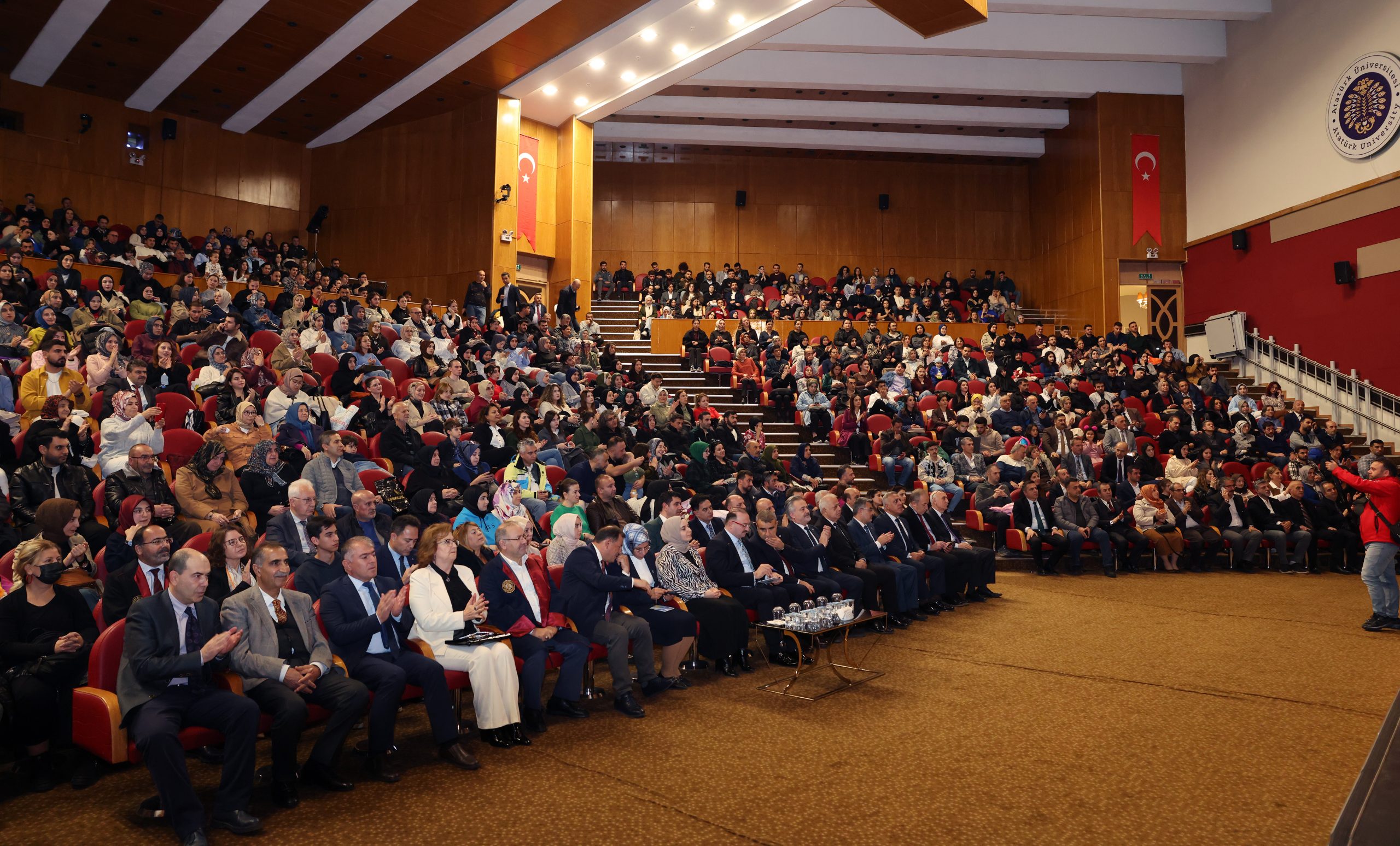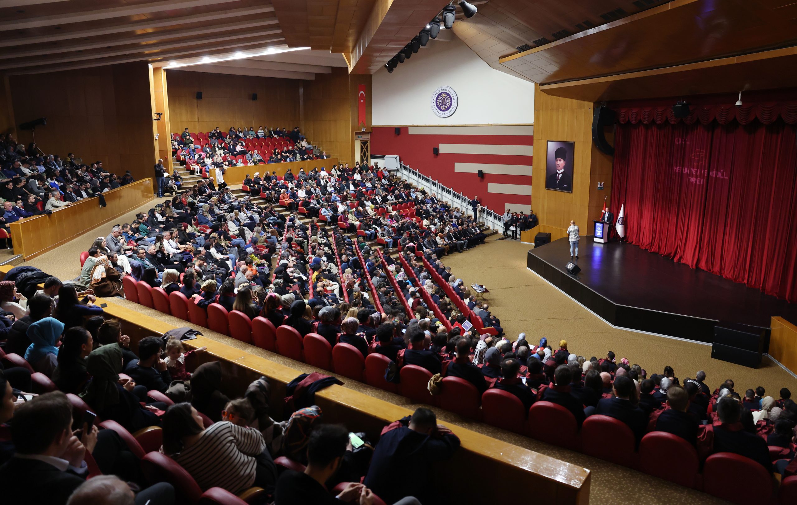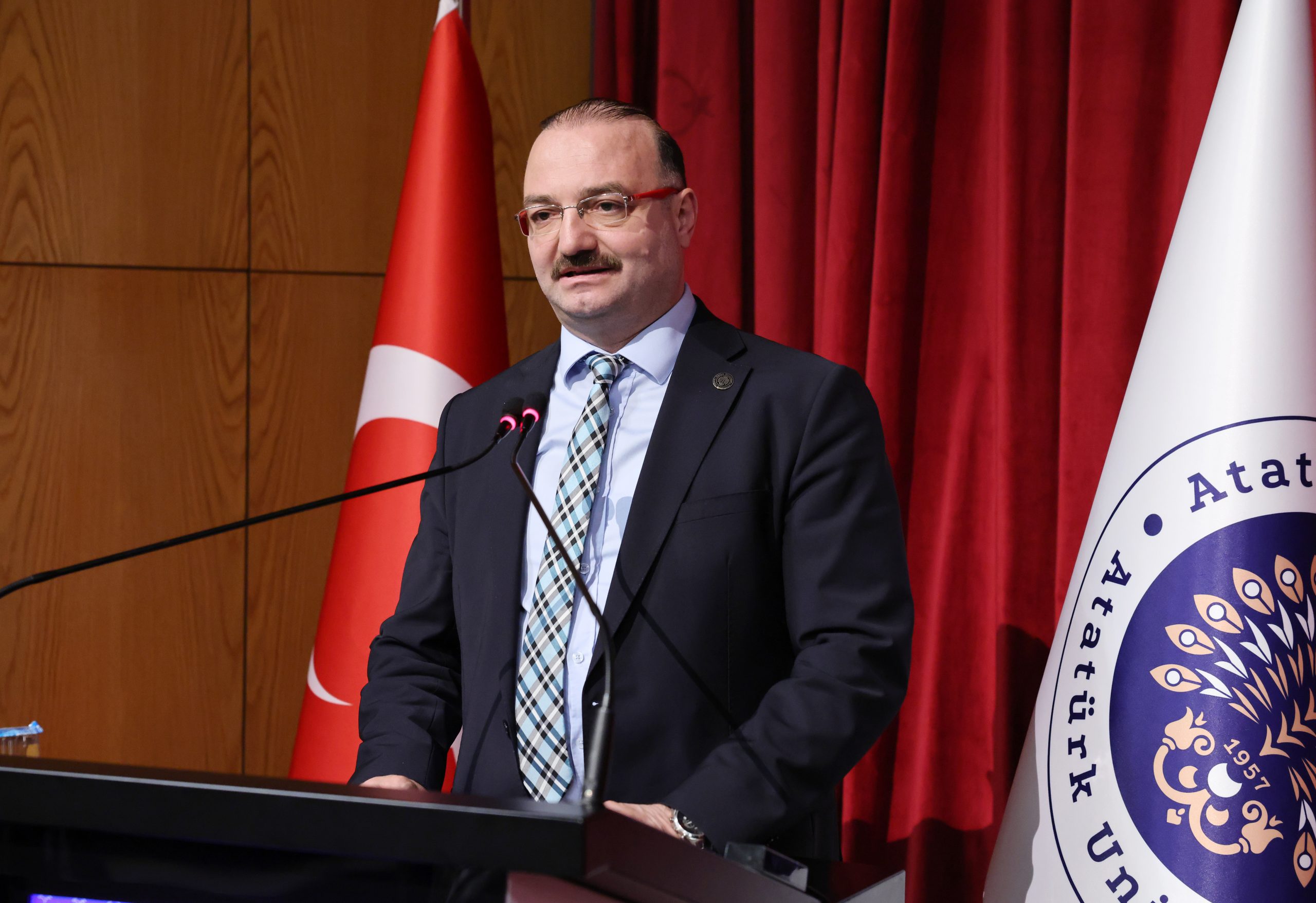 Rektör Hacımüftüoğlu, konuşmasının devamında Atatürk Üniversitesinin son yıllarda akademik üretkenlik, proje sayısı, uluslararası yayın performansı ve lisansüstü mezun sayısı açısından ülkemizin önde gelen yükseköğretim kurumlarından biri hâline geldiğini belirtti.