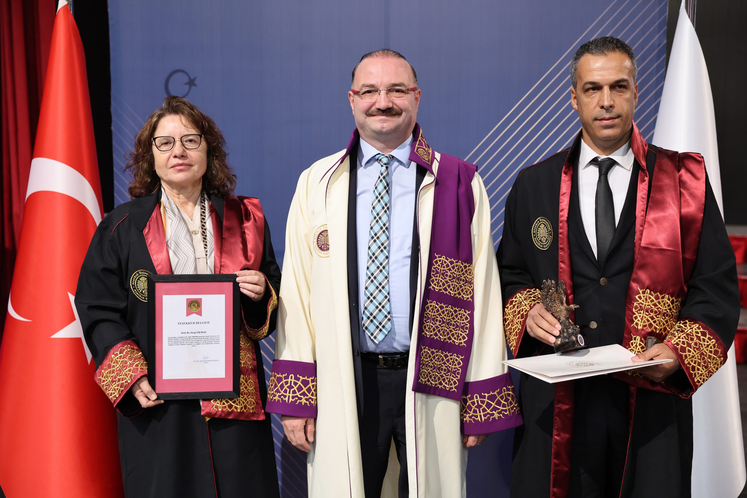 Ödül sahiplerine belgeleri, altın ve plaketleri Rektör Prof. Dr. Ahmet Hacımüftüoğlu tarafından takdim edildi.