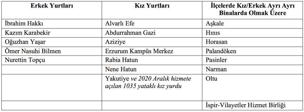 *Bütün bunların yanı sıra il merkezinde ve diğer tüm ilçelerde devlet kurumlarının/özel sektörün işlettiği çok sayıda özel yurt ve pansiyon bulunmaktadır.