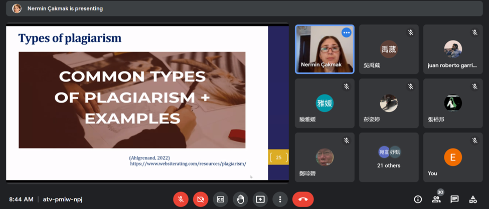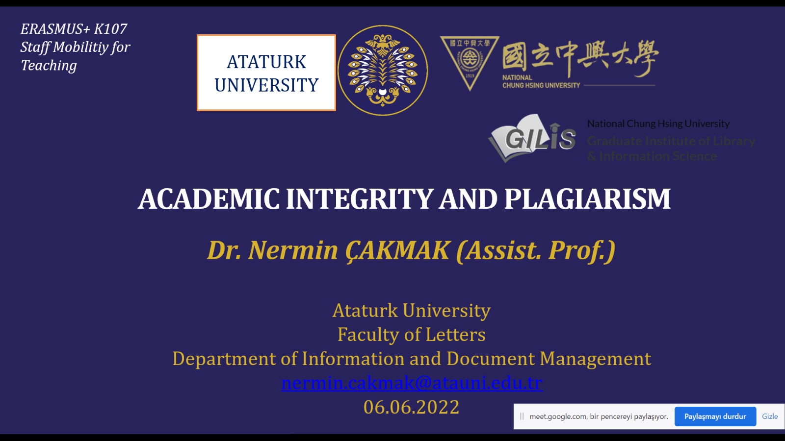 Bölümümüz öğretim üyelerinden Dr. Öğr. Üyesi Nermin ÇAKMAK, 06 Haziran 2022 tarihinde Erasmus+K107 programı kapsamında Tayvan “National Chung Hsing Üniversitesi”nde çevrim içi personel ders verme hareketliliği gerçekleştirmiştir. Program kapsamında “Academic Integrity and Plagiarism” konusunda lisans ve lisansüstü öğrencilere ders vermiştir. Derse öğrenciler yoğun katılım sağlamış ve ilgi göstermişlerdir.