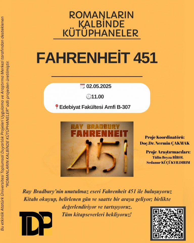 Bölümümüz Öğretim Üyelerinden Doç.Dr. Nermin ÇAKMAK’ın yürütücülüğünü yaptığı “Romanların Kalbinde Kütüphaneler Fahrenheit 451” adlı etkinliğe ait afiş aşağıda verilmiştir. Ekinliğe tüm öğrencilerimiz davetlidir.