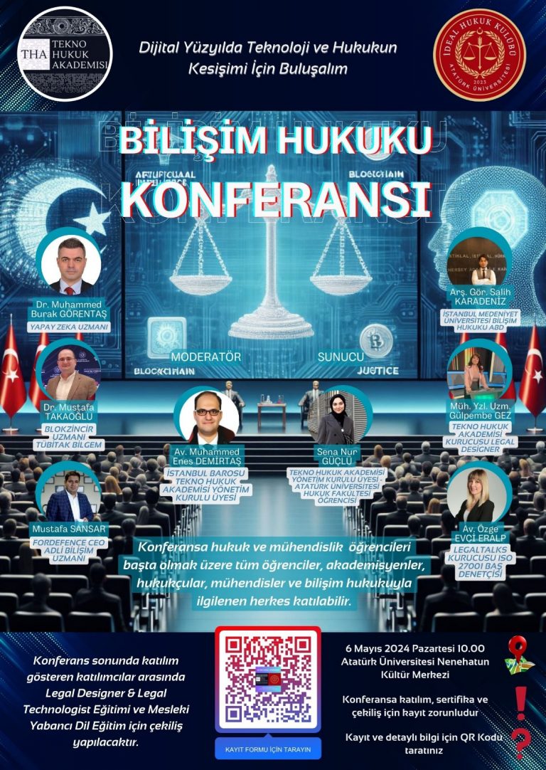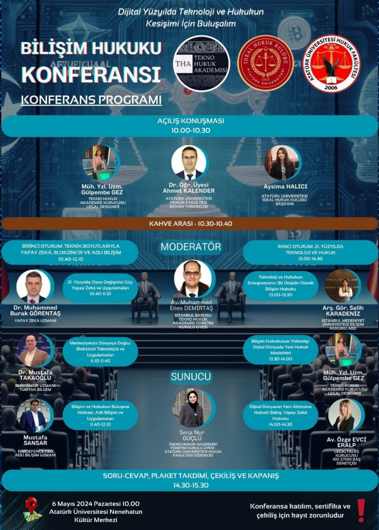 Hukuk Fakültesi İdeal Hukuk Kulübü ve Tekno Hukuk Akademisi işbirliğinde düzenlenen “Bilişim Hukuku Konferansı”06 Mayıs 2024 Pazartesi günü saat 10.00‘da Atatürk Üniversitesi Nenehatun Kültür Merkezi‘nde gerçekleştirilecektir.