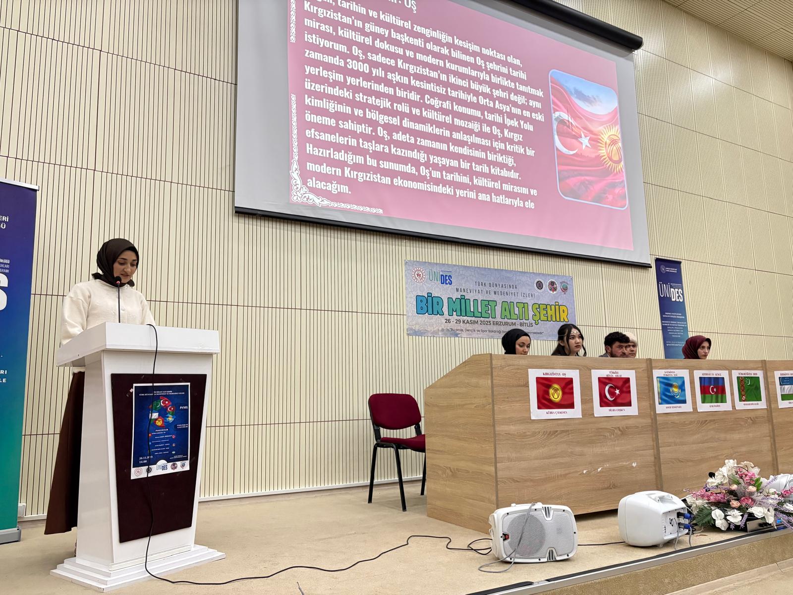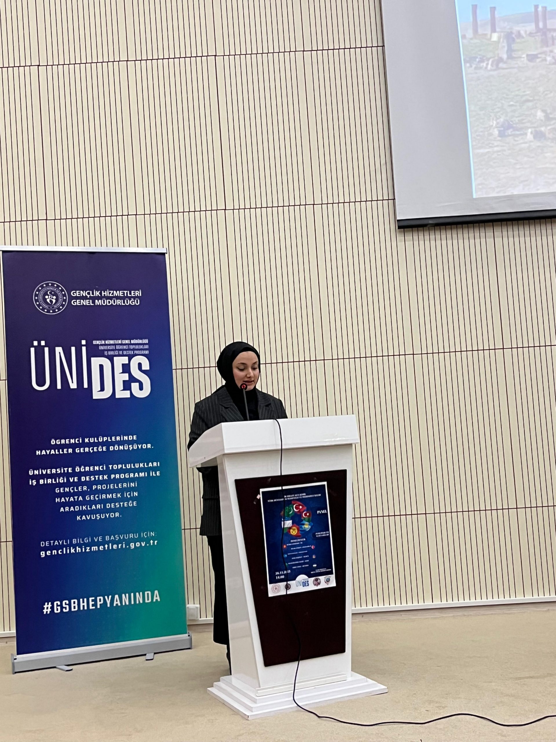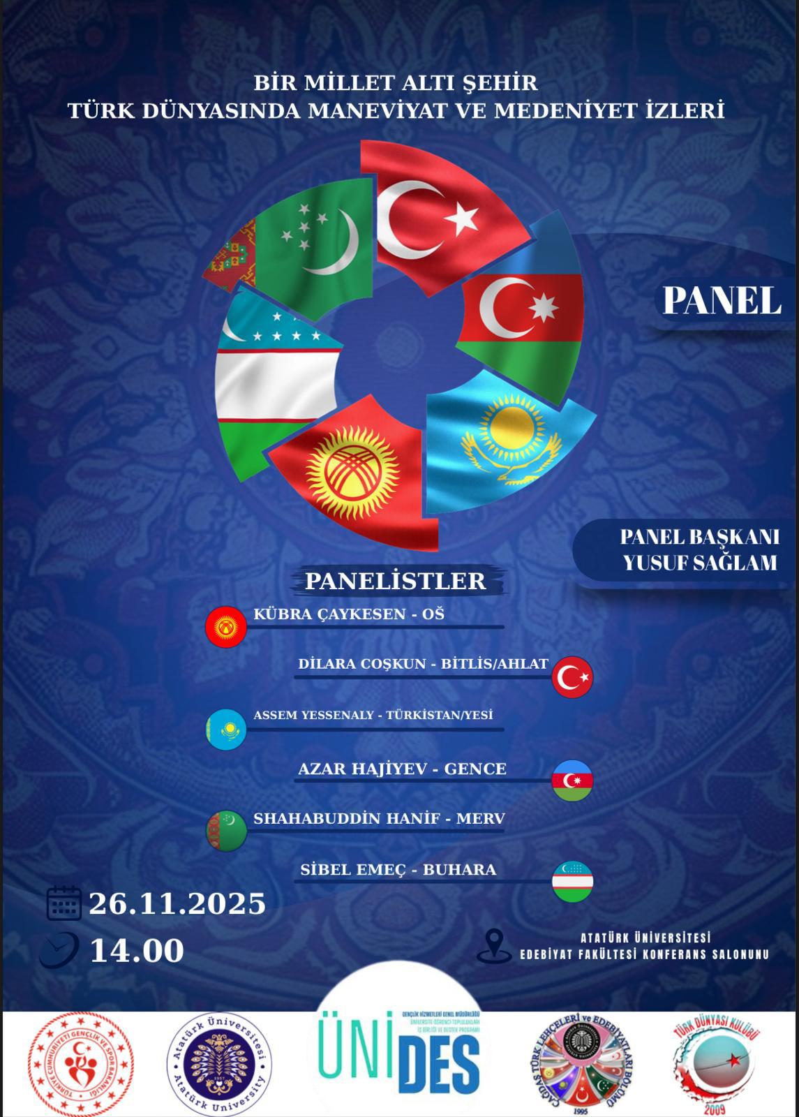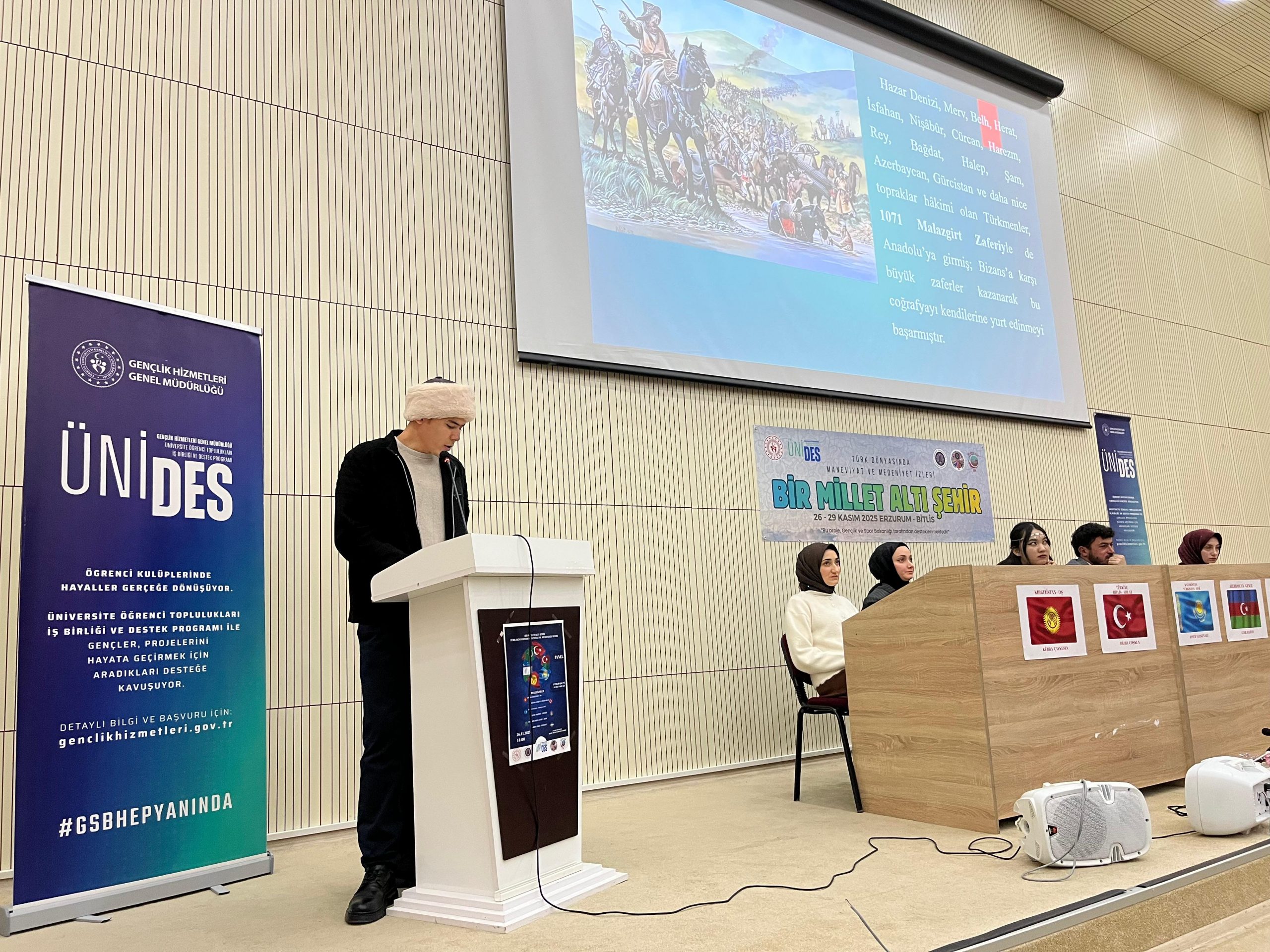 26.11.2025 tarihinde Bölümümüz bünyesinde bulunan Türk Dünyası Kulübü, Gençlik ve Spor Bakanlığı’nın desteklediği ÜNİDES programı kapsamında “Türk Dünyasında Maneviyat ve Medeniyet İzleri: Bir Millet Altı Şehir” adlı bir panel gerçekleştirdi. Panel, başta ulu önder Mustafa Kemal Atatürk ve aziz şehitlerimizin anısına saygı duruşu ve İstiklal Marşı’nın okunmasıyla başladı. Ardından, programa desteklerini esirgemeyen Erzurum Gençlik Spor İl Müdürlüğü ÜNİDES programı yürütücülerinden Gençlik Lideri Sayın Mehmet Emin Daş kürsüye davet edildi ve açılış konuşmaları, Bölüm Başkan Yardımcısı Sayın Prof. Dr. Mayramgül Dıykanbay tarafından gerçekleştirildi.