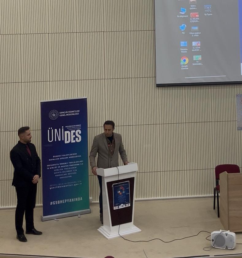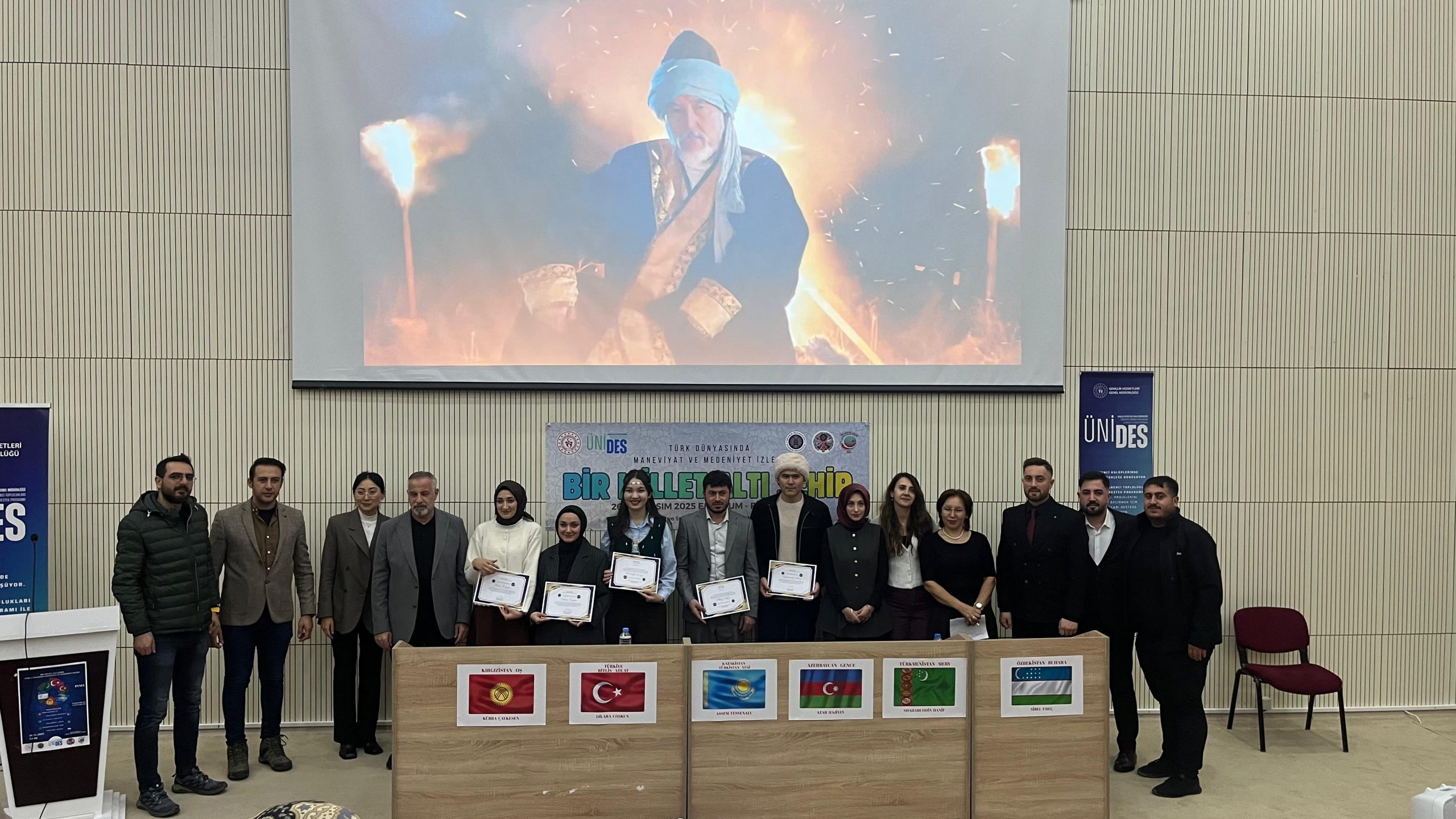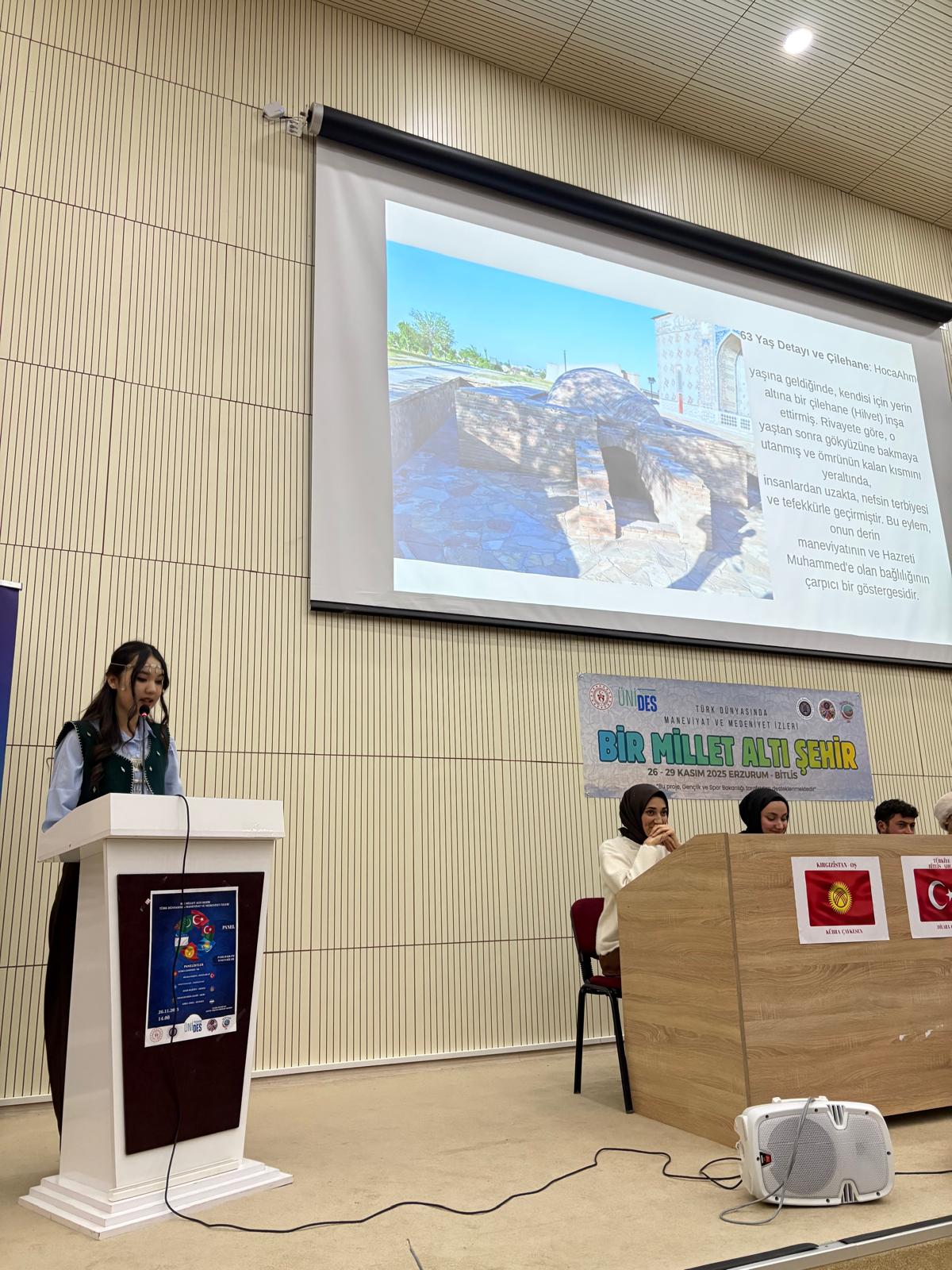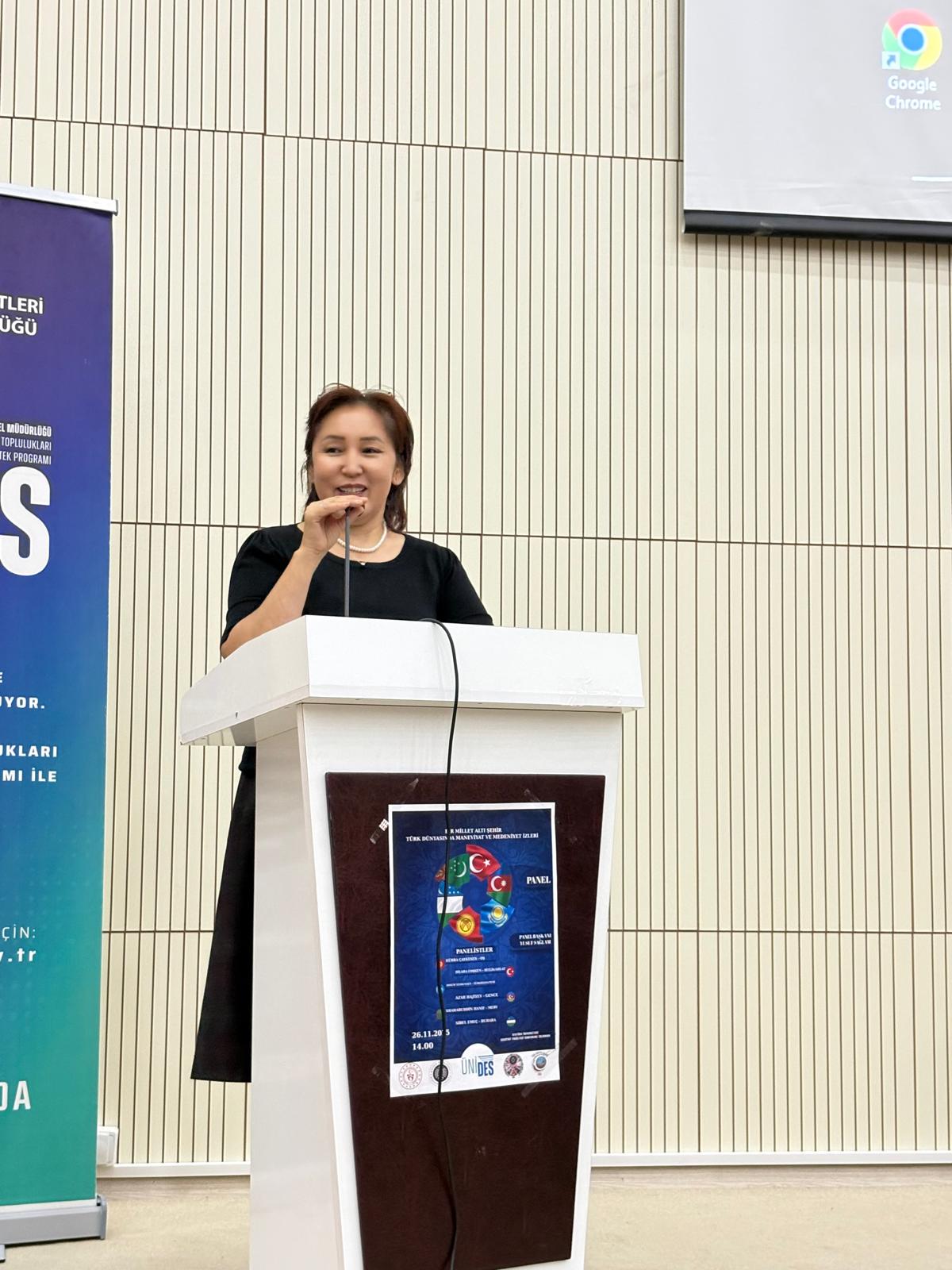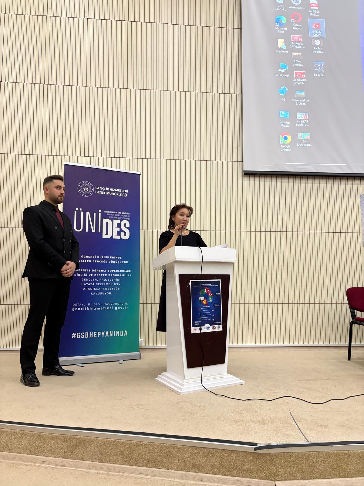 26.11.2025 tarihinde Bölümümüz bünyesinde bulunan Türk Dünyası Kulübü, Gençlik ve Spor Bakanlığı’nın desteklediği ÜNİDES programı kapsamında “Türk Dünyasında Maneviyat ve Medeniyet İzleri: Bir Millet Altı Şehir” adlı bir panel gerçekleştirdi. Panel, başta ulu önder Mustafa Kemal Atatürk ve aziz şehitlerimizin anısına saygı duruşu ve İstiklal Marşı’nın okunmasıyla başladı. Ardından, programa desteklerini esirgemeyen Erzurum Gençlik Spor İl Müdürlüğü ÜNİDES programı yürütücülerinden Gençlik Lideri Sayın Mehmet Emin Daş kürsüye davet edildi ve açılış konuşmaları, Bölüm Başkan Yardımcısı Sayın Prof. Dr. Mayramgül Dıykanbay tarafından gerçekleştirildi.