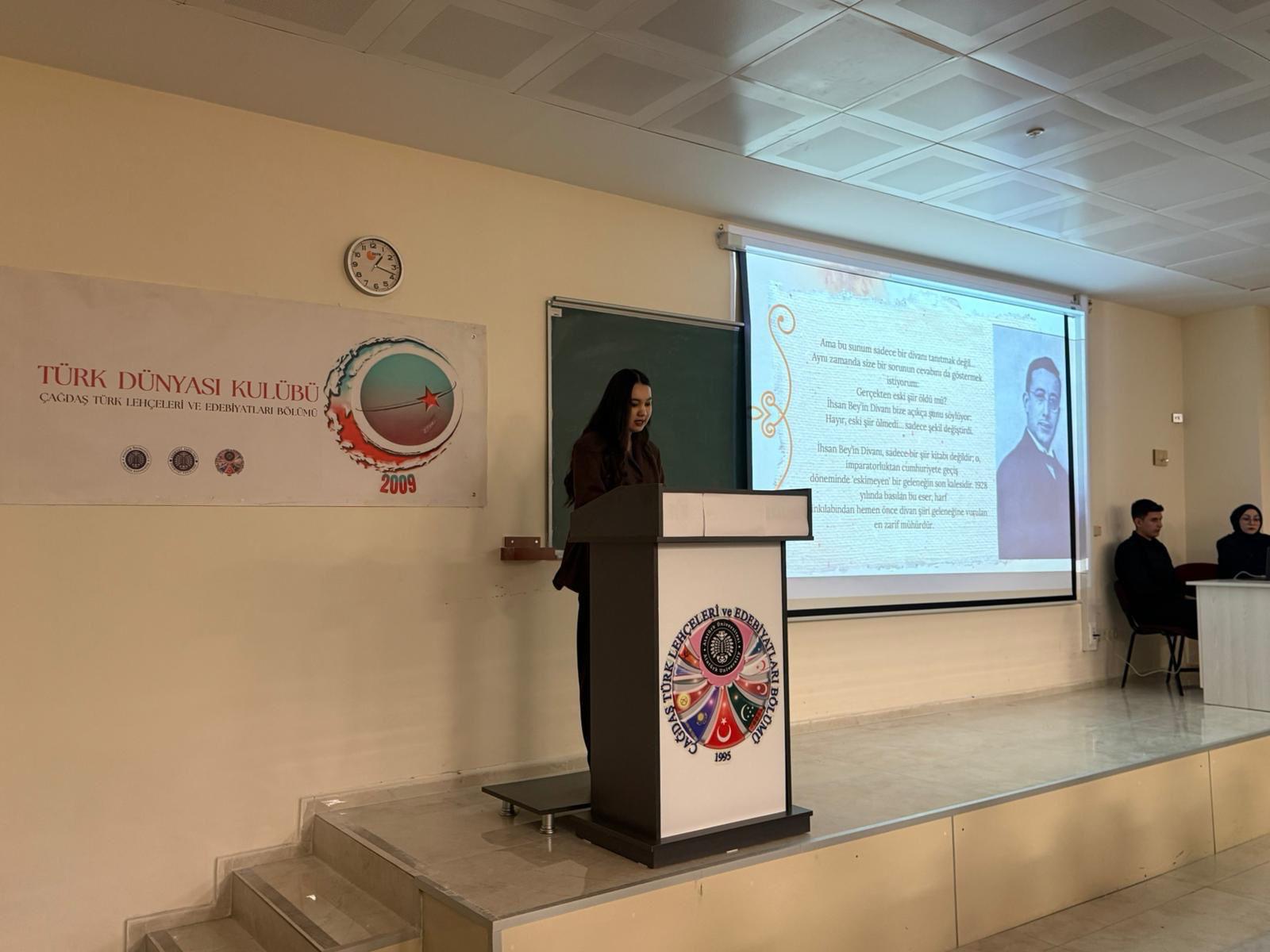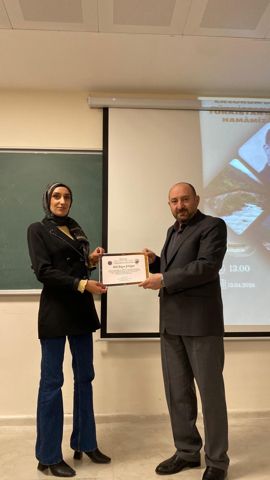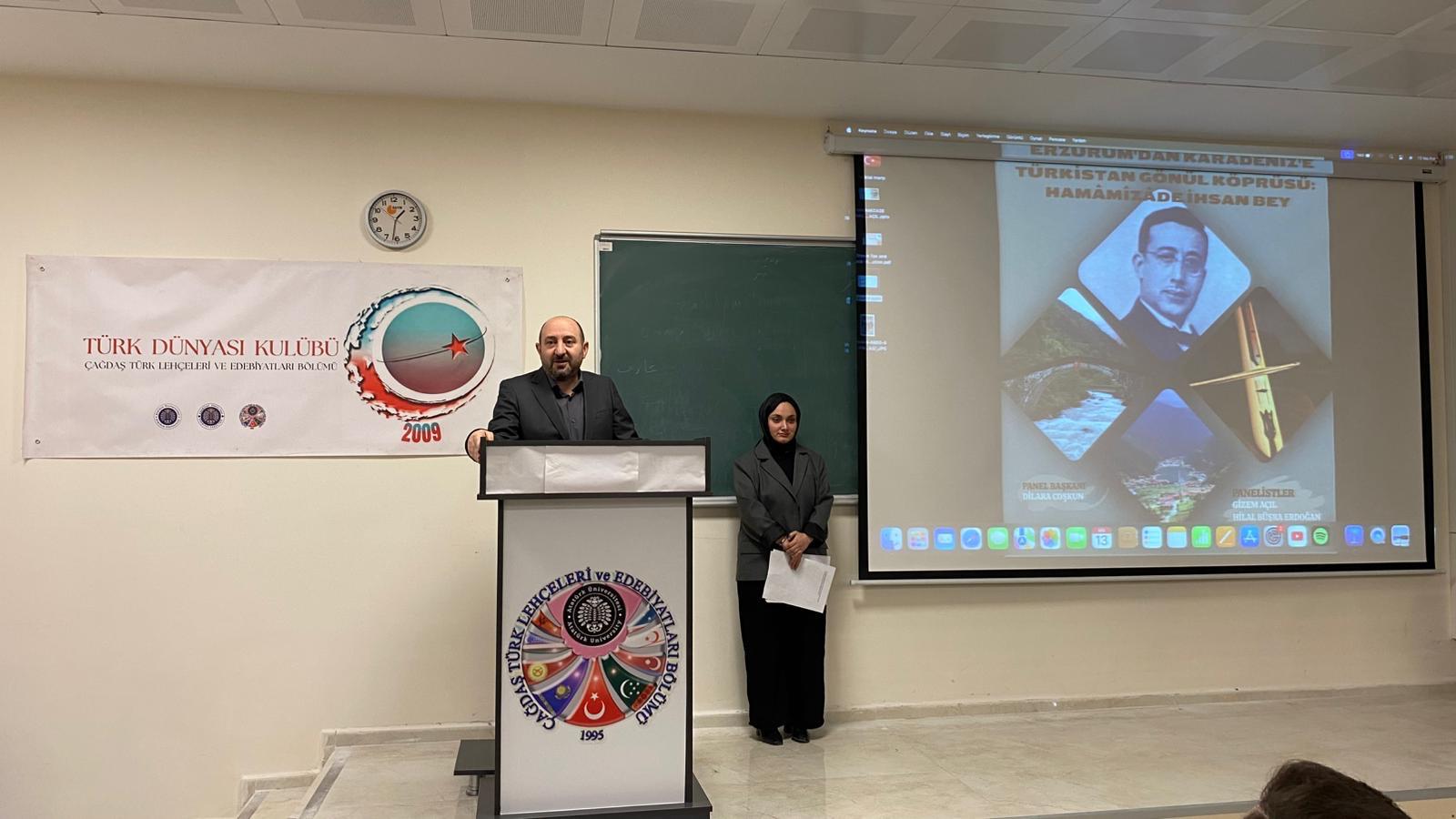 Edebiyat Fakültesi Çağdaş Türk Lehçeleri ve Edebiyatları Bölümü bünyesinde yer alan Türk Dünyası Kulübü olarak 13.04.2026 tarihinde ÜNİDES projesi kapsamında “Erzurumdan Karadenize Türkistan Gönül Köprüsü: Hamâmîzâde İhsan Bey” başlıklı panel, yoğun katılımla 206 amfide gerçekleştirildi.