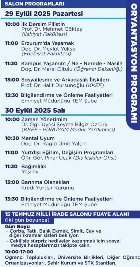 Bölümümüz 1.sınıf öğrencilerinin bölüm, şehir ve üniversite uyumu kapsamında her yıl gerçekleştirilen oryantasyon 2025 programı aşağıda yer almaktadır. Ek olarak bölümümüzün güncel oryantasyon sunusu için TIKLAYINIZ