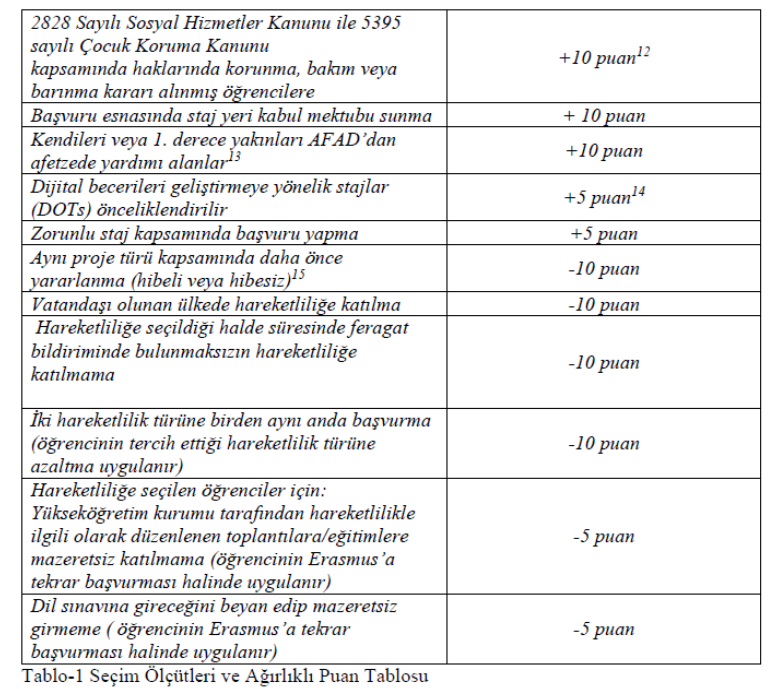 13) Her bir eğitim kademesi (lisans, yüksek lisans, doktora) ve her bir proje türü (KA131-KA171) için birer defaya mahsus olarak uygulanır. Hareketliliğe katıldığı takdirde öğrencinin sonraki başvurularında uygulanmaz. Ek puan, öğrenci hareketliliğe katılmadığı takdirde (feragat süresi içerisinde vazgeçilmişse veya mücbir bir sebep varsa) sonraki başvurularında da uygulanmaya devam olunur.