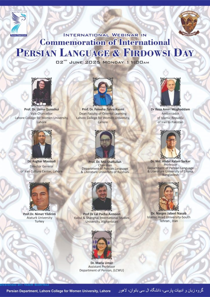 İran’ın büyük şairi Firdevsi’yi Anma etkinlikleri dünyanın çeşitli ülkelerinde düzenlenmeye devam ederken Pakistan’da bu ülkeler arasında yer alarak 02.06.2025 tarihinde bir webinar düzenledi. Pakistan Women College for University’nin düzenlediği bu webinara Türkiye’den bölümümüz öğretim üyesi Prof. Dr. Nimet Yıldırım katıldı.