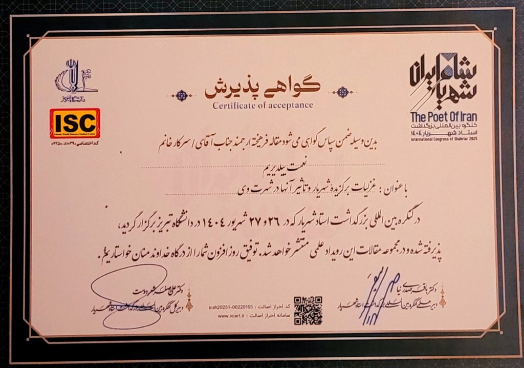 30 Eylül 2025 Uluslararası Şehriyar Kongresi Fars Dili ve Edebiyatı bölüm başkanı Prof. Dr. Nimet YILDIRIM Tebriz’de 17-18 Eylül 2025 tarihinde düzenlenen Uluslararası Şehriyar Kongresine davetli konuşmacı olarak katıldı.