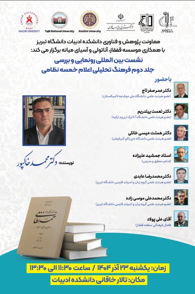 Tebriz Üniversitesi Fars Dili ve Edebiyatı Bölümü öğretim üyesi Doç. Dr. Muhammed Hakpur tarafından kaleme alınan “Ferheng-i Tahlili-yi A’lam-i Hamse-yi Nizami-yi Gencevi” adlı kitabın tanıtımı yapıldı. Etkinlik akademisyenler, araştırmacılar ve Fars edebiyatına ilgi duyanların yoğun katılımıyla gerçekleştirildi. Etkinliğe Türkiye’den Fars Dili ve Edebiyatı bölüm başkanı Prof. Dr. Nimet Yıldırım katıldı.