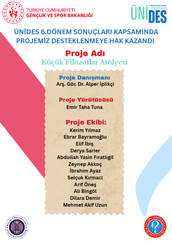 Edebiyat Fakültesi Felsefe Kulübü’nün düzenlemiş olduğu “Küçük Filozoflar Atölyesi” Projesi T.C. Gençlik ve Spor Bakanlığı ÜNİDES Destek Programı tarafından fonlanmaya hak kazanmıştır.
