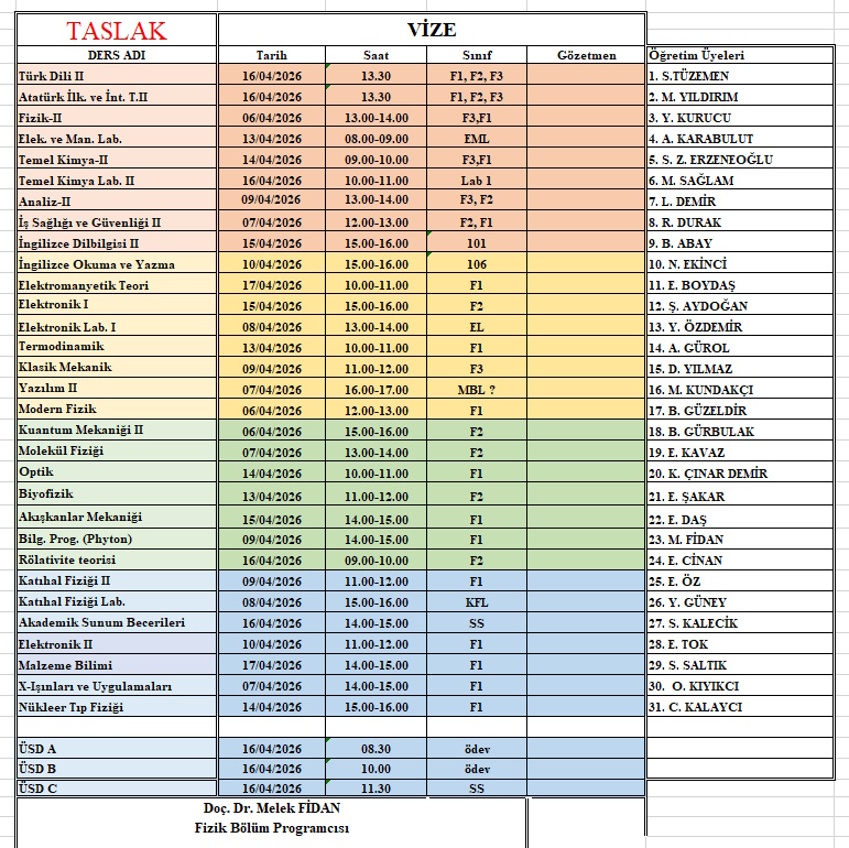 2025-2026 Eğitim-Öğretim Yılı Bahar Dönemi Vize Programı Taslağı