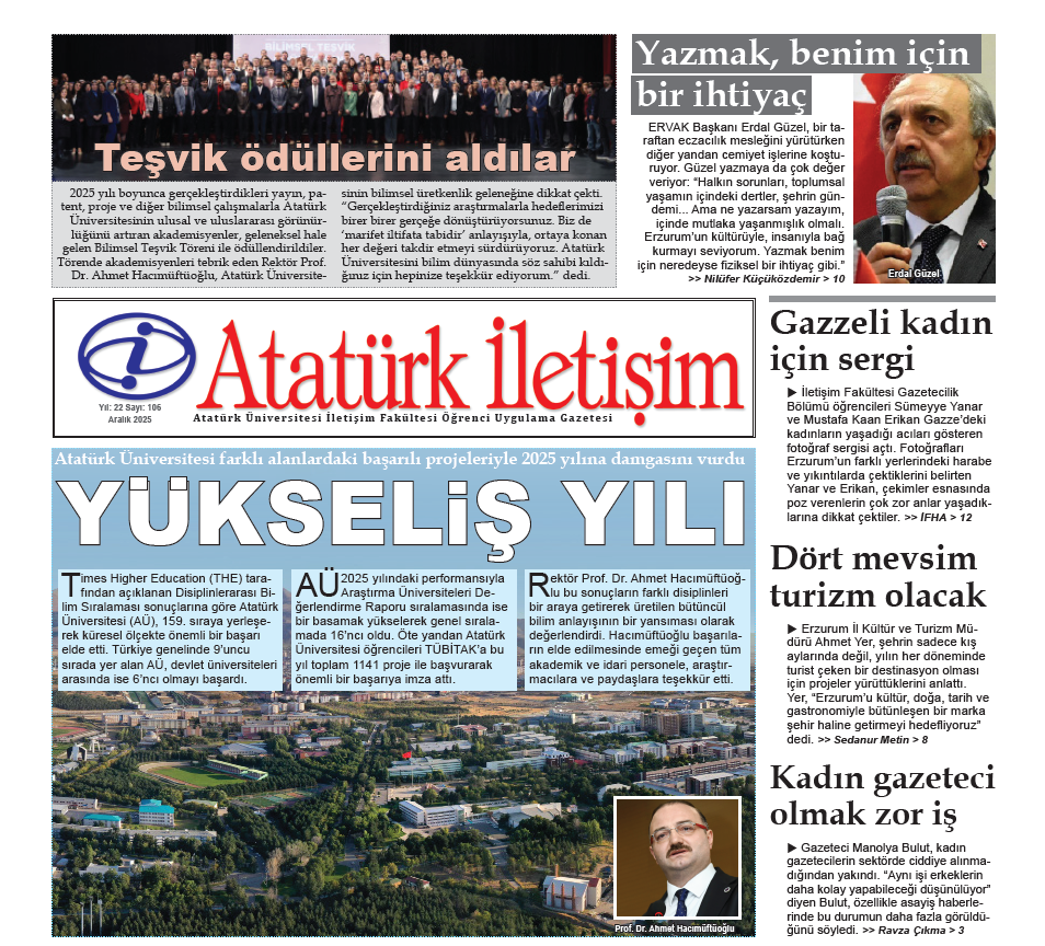Atatürk Üniversitesi İletişim Fakültesi bünyesinde yayımlanan öğrenci uygulama gazetesi Atatürk İletişim, 22. yayın yılında 106. sayısına ulaştı. Aralık 2025 tarihli bu sayıda üniversitenin uluslararası alandaki yükselişi, yükseköğretim gündemine ilişkin gelişmeler ve şehrin toplumsal sorunları kapsamlı biçimde ele alındı.