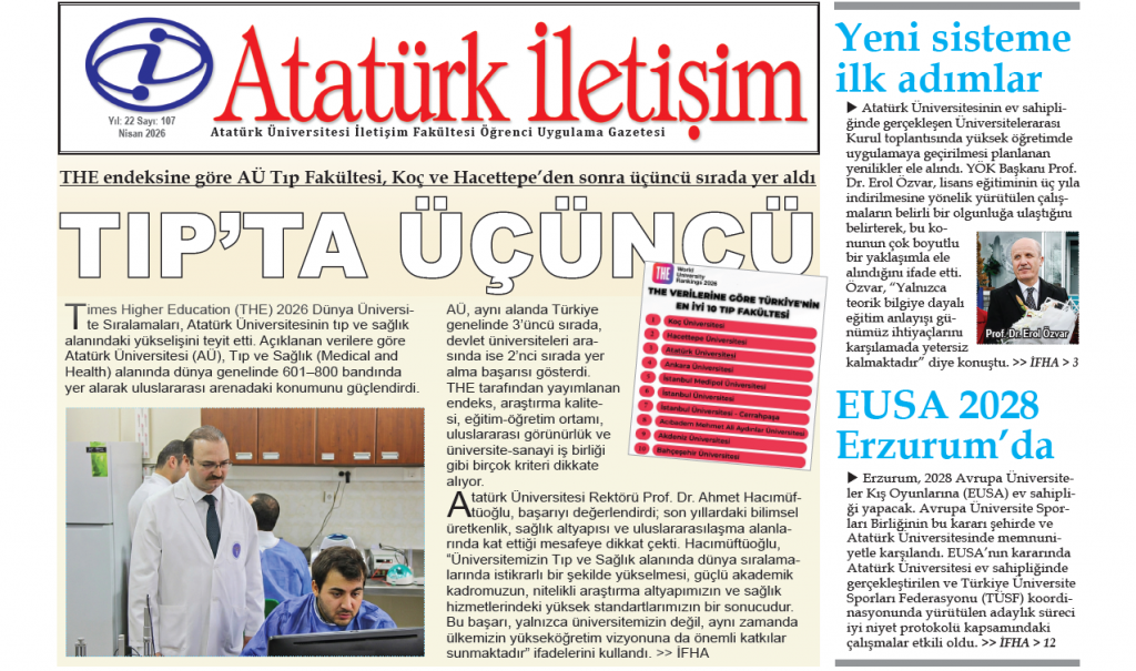 Atatürk Üniversitesi İletişim Fakültesi bünyesinde yayımlanan öğrenci uygulama gazetesi Atatürk İletişim, 22. yayın yılında 107. sayısına ulaştı. Nisan 2026 tarihli bu sayıda şehir haberciliğinden üniversite haberlerine, toplumsal sorunlardan sağlık gündemine kadar geniş bir içerik yelpazesi okuyuculara sunuldu.