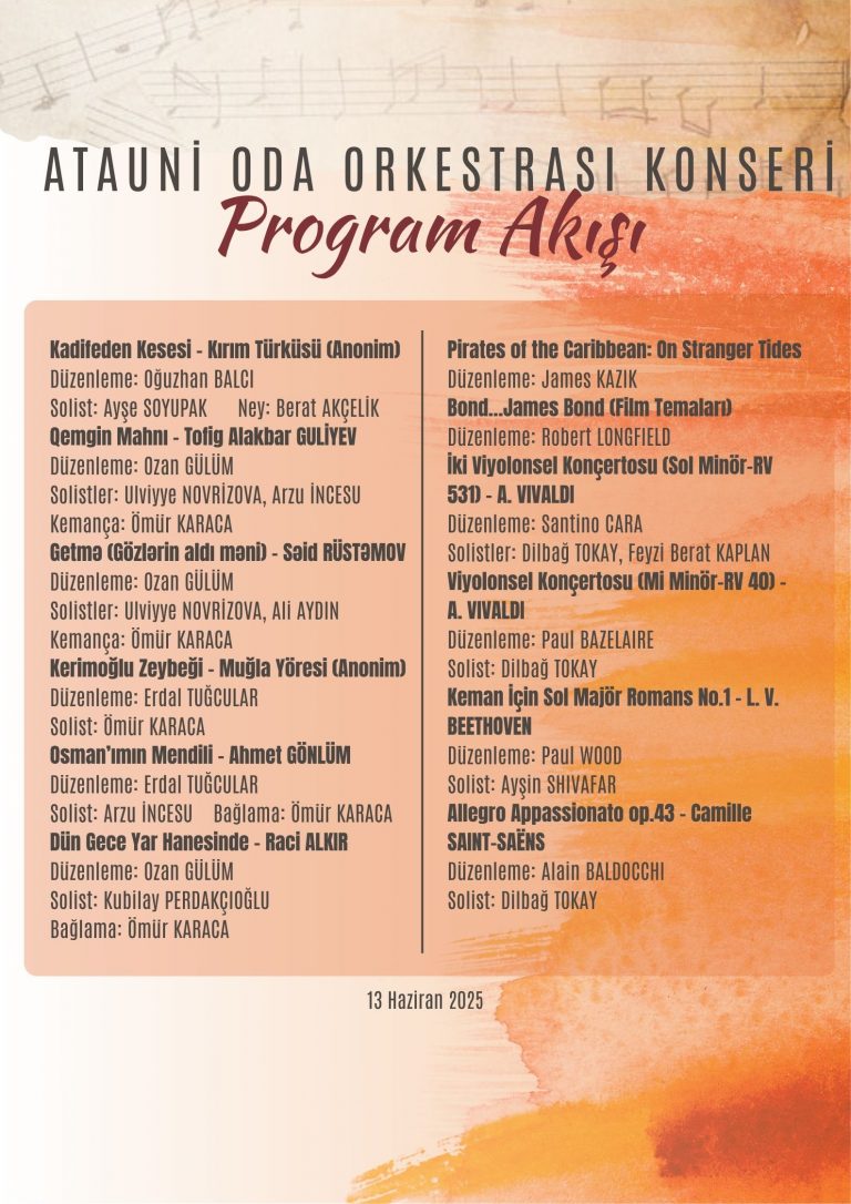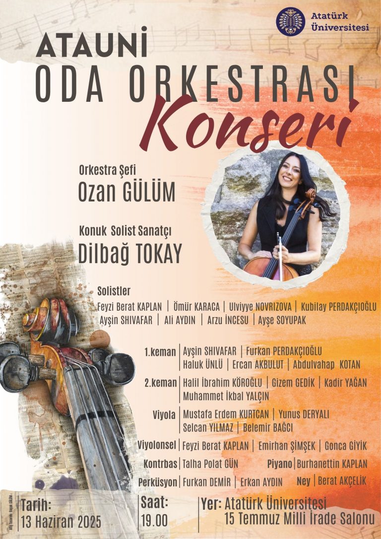 Atatürk Üniversitesi bünyesinde kurulan ve bölümümüz Müzik Eğitimi öğrencilerinin de bulunduğu Oda Orkestrası, ilk konserini yoğun katılımla gerçekleştirdi. Atatürk Üniversitesi 15 Temmuz Milli İrade Salonunda düzenlenen, Orkestra Şefliğini Kazım Karabekir Eğitim Fakültesi Güzel Sanatlar Eğitimi Bölümü’nden Doç. Dr. Ozan Gülüm’ün üstlendiği konserin konuk solisti ise ülkemizin önemli viyolonsel sanatçılarından Doç. Dilbağ Tokay oldu. Farklı enstrüman gruplarından çok sayıda yetenekli müzisyenin yer aldığı Oda Orkestrası, Türk Müziği’nin ve klasik müziğin seçkin eserlerinin yanı sıra film müziklerini de başarıyla icra etti.
