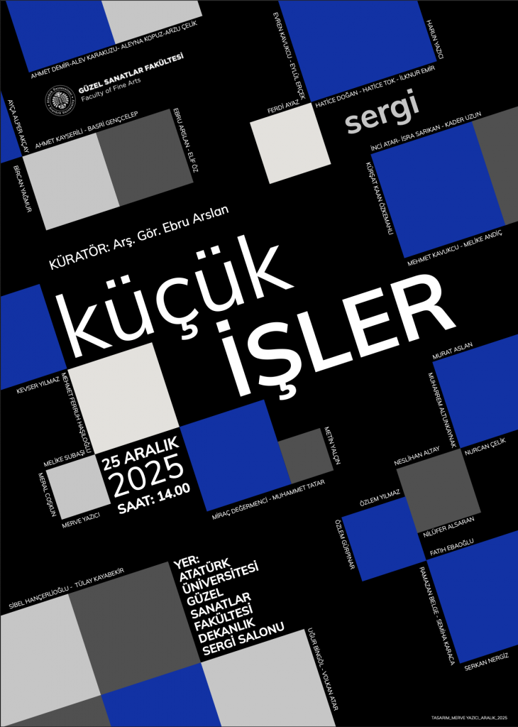 24 Aralık 2025 “Küçük İşler” Sergisi Fakültemiz Güz Sergileri kapsamında, küratörlüğünü Arş. Gör. Ebru Arslan’ın üstlendiği “Küçük İşler” sergisi,25 Aralık 2025 tarihinde saat 14.00’teGüzel Sanatlar Fakültesi Dekanlık Sergi Salonu’nda izleyiciyle buluşuyor.Tüm sanatseverler davetlidir.