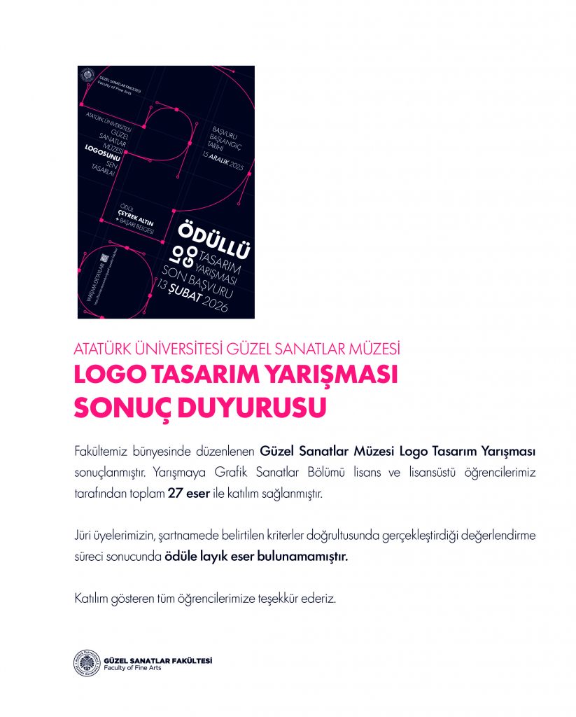 Fakültemiz bünyesinde düzenlenen Güzel Sanatlar Müzesi Logo Tasarım Yarışması sonuçlanmıştır. Yarışmaya Grafik Sanatlar Bölümü lisans ve lisansüstü öğrencilerimiz tarafından toplam 27 eser ile katılım sağlanmıştır.