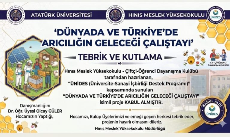 Meslek Yüksekokulumuz öğretim elemanlarından Dr. Öğr. Üyesi Olcay GÜLER’in danışmanlığını yaptığı, Hınıs Meslek Yüksekokulu Çiftçi – Öğrenci Dayanışma Kulübü tarafından hazırlanan “Dünyada ve Türkiye’de Arıcılığın Geleceği Çalıştayı” başlıklı proje ÜNİDES kapsamında kabul edilmiştir. Hocamızı, kulüp üyelerimizi ve emeği geçen herkesi tebrik eder, başarılarının devamını dileriz.