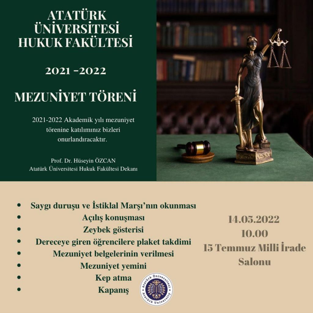 12 Mayıs 2022 MEZUNİYET TÖRENİ Fakültemiz 2021-2022 eğitim öğretim yılı mezun öğrencilerimiz için 14 Mayıs 2022 Cumartesi günü saat 10.00’da Üniversitemiz 15 Temmuz Milli İrade Salonunda yapılacak olan mezuniyet töreninde sizleri de aramızda görmekten onur duyarız.Prof.Dr. Hüseyin ÖZCAN Hukuk Fakültesi Dekanı