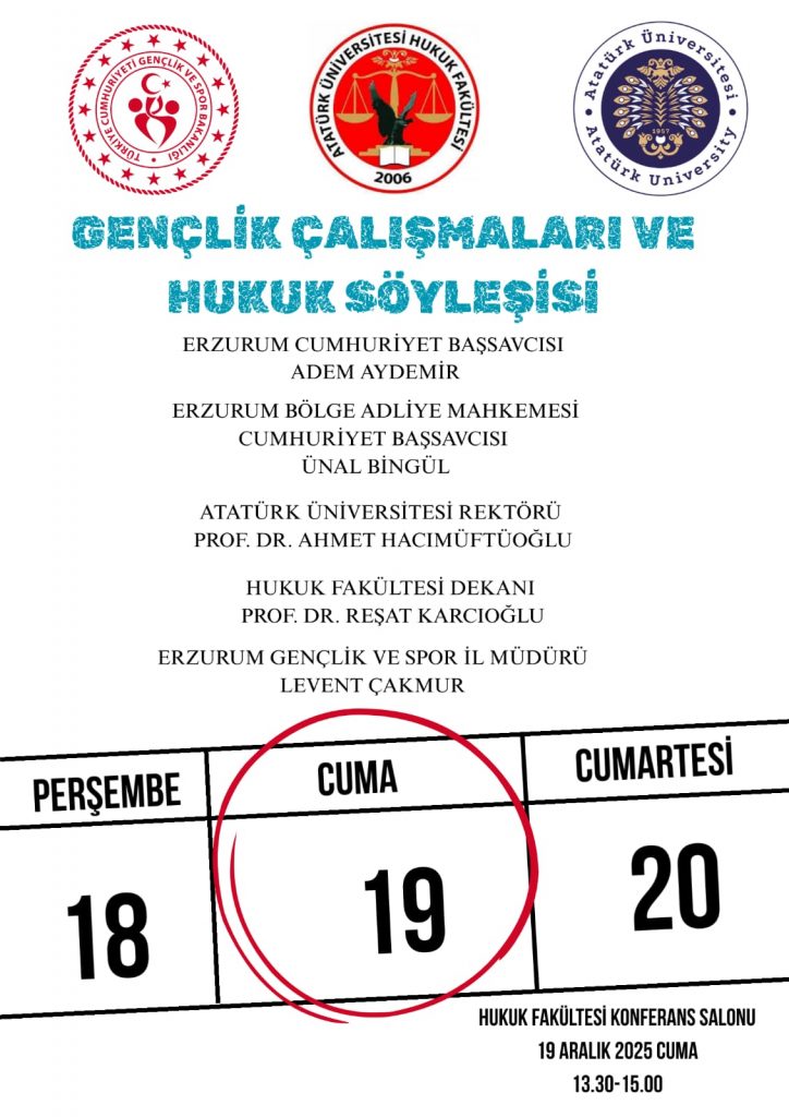 17 Aralık 2025 Gençlik Çalışmaları ve Hukuk Söyleşisi Yer: Hukuk Fakültesi Konferans SalonuTarih: 19 Aralık 2025 CumaSaat: 13:30-15:00