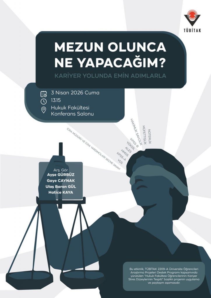 Hukuk Fakültesi Konferans Salonu’nda, TÜBİTAK 2209-A Üniversite Öğrencileri Araştırma Projeleri Destek Programı kapsamında, Arş. Gör. Ayşe Gürbüz ile fakülte öğrencileri Ulaş Baran Gül, Gaye Caynak ve Hatice Kaya tarafından “Hukuk Fakültesi Öğrencilerinin Kariyer Stres Düzeylerinin Tespiti” başlıklı projenin kapanışı etkinliği yapılmıştır. Etkinliğe, öğretim elemanları ve öğrenciler katıldı.
