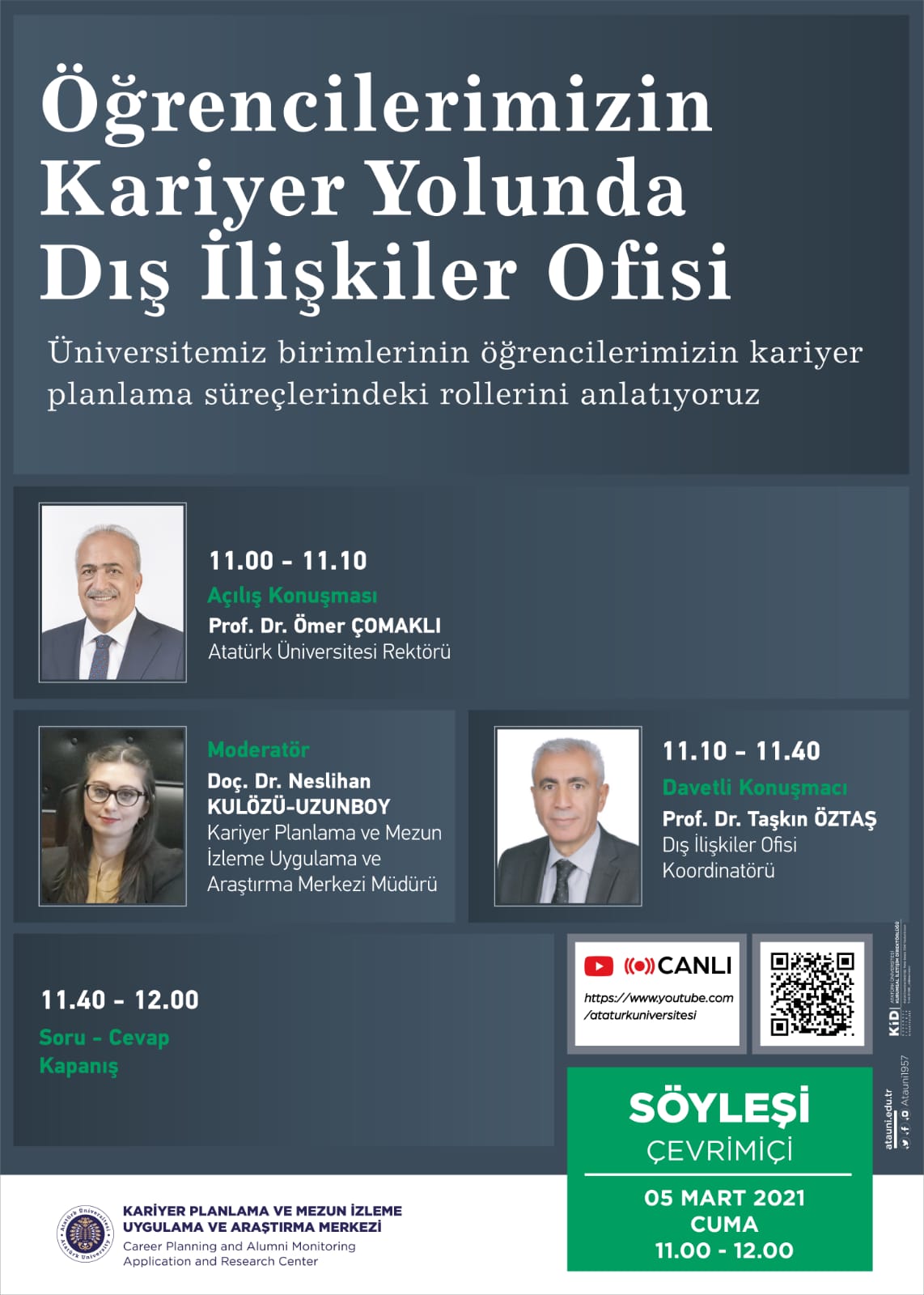 Üniversitemiz Kariyer Planlama ve Mezun İzleme Uygulama ve Araştırma Merkezi tarafından düzenlenen çevrimiçi “Öğrencilerimizin Kariyer Yolunda” Söyleşi serisinin ikincisi 5 Mart 2021, Cuma günü 11:00-12:00 saatleri arasında gerçekleştirilecektir. Dış İlişkiler Ofisi Koordinatörü Prof. Dr. Taşkın ÖZTAŞ’ın davetli konuşmacı olarak katılacağı ve üniversitemizin youtube kanalında (https://www.youtube.com/ataturkuniversitesi) canlı yayınlanacak söyleşiye ait duyuru afişi ektedir.