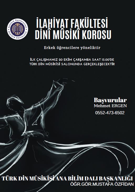 19 Ekim 2021 Dinî Mûsikî Korosu (11.10.2021) Fakültemiz bünyesinde Öğr. Gör. Mustafa ÖZFİDAN yürütücülüğünde Dinî Mûsikî Korosu dersleri başlayacaktır. Başvuruya ilişkin görsel ektedir.Dersler erkek öğrencilerimize yöneliktir.